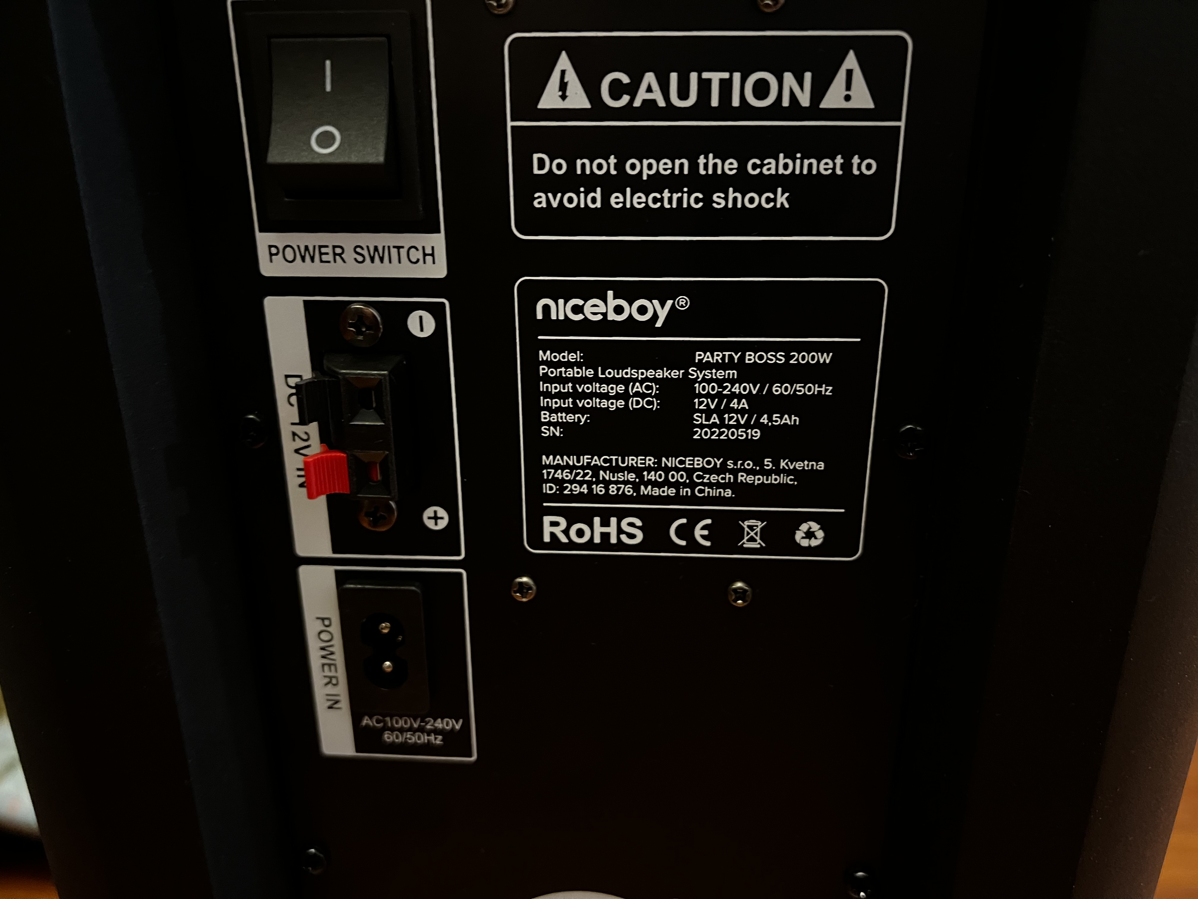 V tomto odstavci se pořádně zaměříme na to, co Niceboy Party Boss 200 W nabídne po stránce technických specifikací. Reproduktor disponuje Bluetooth ve verzi 5.0, RMS výkonem 200 W, dvěma woofery o velikosti 8“ (citlivost 88dB a frekvenční rozsah 20 Hz až 6 kHz), dvěma tweetery o velikosti 2“ (citlivost 85dB a frekvenční rozsah 40 Hz až 20 kHz), bezdrátový mikrofon s citlivostí 5 dB a frekvenčním rozsahem 40 Hz až 15 kHz. Výrobce uvádí, že na jedno nabití vydrží reprák až 8 hodin provozu. Plné nabití by pak mělo trvat 4 hodiny. Nejedná se opravdu o malé přenosné zařízení. Hmotnost totiž je 11,2 kilogramu. Rozměry jsou 63,5 x 33 x 31 centimetrů.