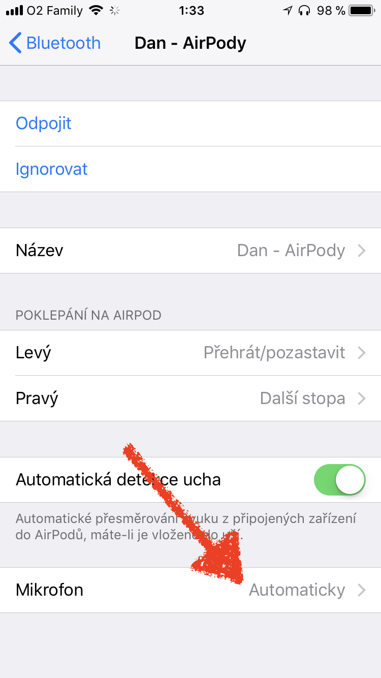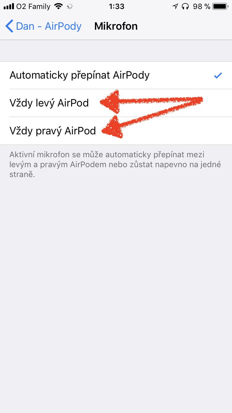 U vašich bezdrátových sluchátek od Applu můžete také určit, který z mikrofonů se bude používat. Ve výchozím nastavení se vždy aktivuje mikrofon toho sluchátka, které máte právě nasazené. Pokud ale chcete aktivní mikrofon přiřadit konkrétnímu sluchátku, spusťte na spárovaném iPhonu Nastavení -> Bluetooth, kde klepnete na ⓘ a aktivujete mikrofon u příslušného sluchátka.
