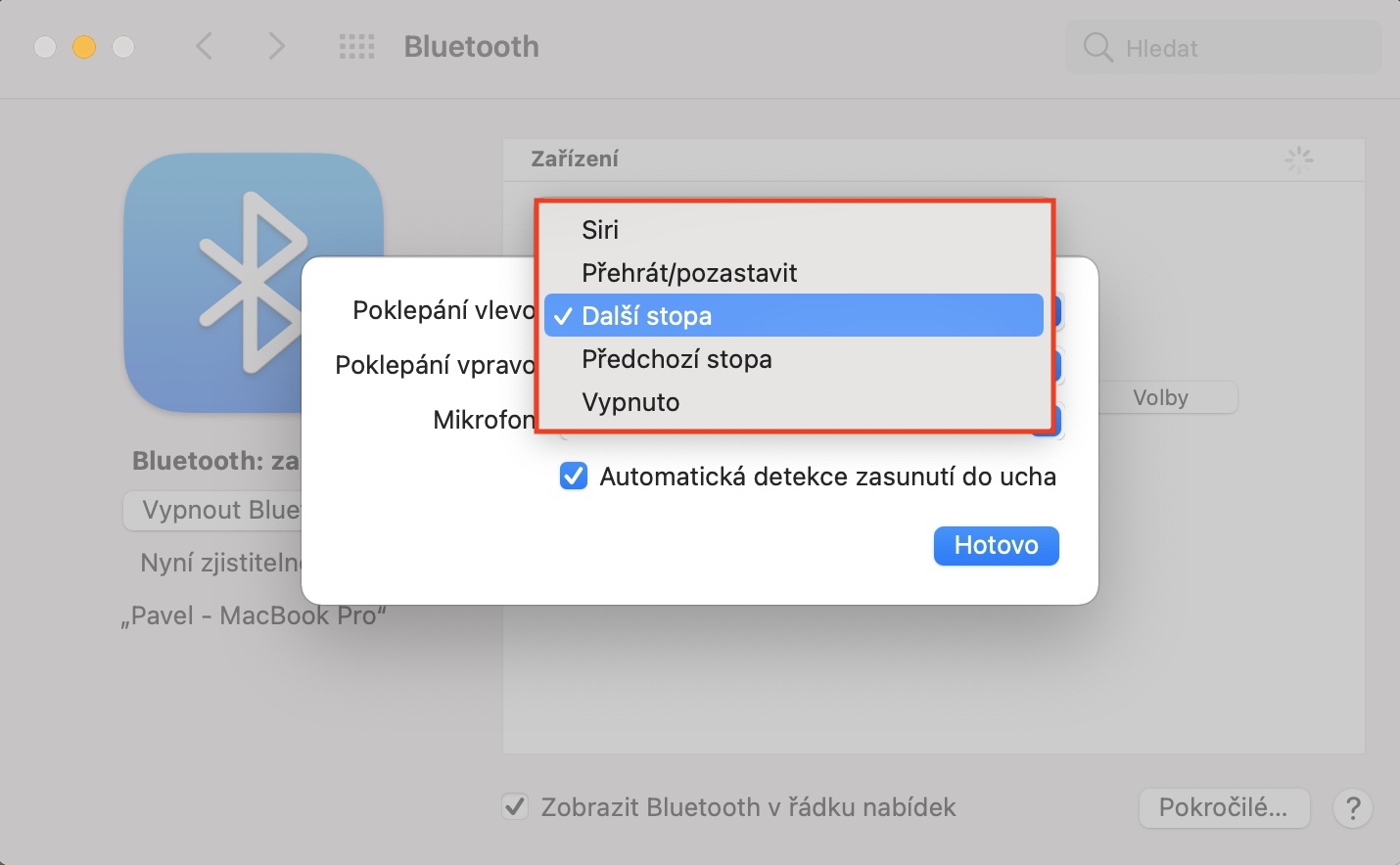 Bezdrátová sluchátka od Applu jsou mimo jiné vybavená senzory, díky kterým po nasazení automaticky rozpoznají, zda se nachází v uchu. Díky tomu je možné automatické pozastavení přehrávání poté, co si AirPody z ucha vyjmete, případě když vám nedopatřením vypadnou. Pro aktivaci automatické detekce ucha spusťte na spárovaném iPhonu Nastavení -> Bluetooth. U názvu svých AirPodů klepněte na malé i v kroužku a aktivujte položku Automatická detekce ucha.