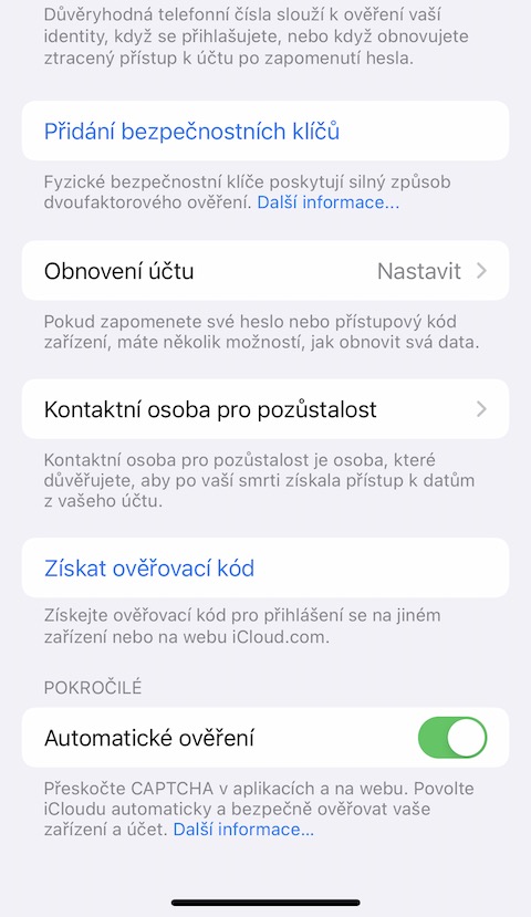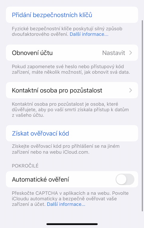 V novějších verzích operačního systému iOS 16 máte také možnost automatického ověření. Pokud si tuto funkci aktivujete, usnadníte si přihlašování k aplikacím a webovým stránkám z vašich Apple zařízení. V případě aktivace funkce Automatického ověření již nebudete muset podstupovat proces verifikace přes funkci CAPTCHA, kdy je potřeba zadávat do textového pole sled znaků, případně identifikovat vybrané obrázky za účelem ověření. Pro aktivaci automatického ověření spusťte na iPhonu Nastavení -> Panel s vaším jménem-> Heslo a zabezpečení, kde zcela dole aktivujete položku Automatické ověření.