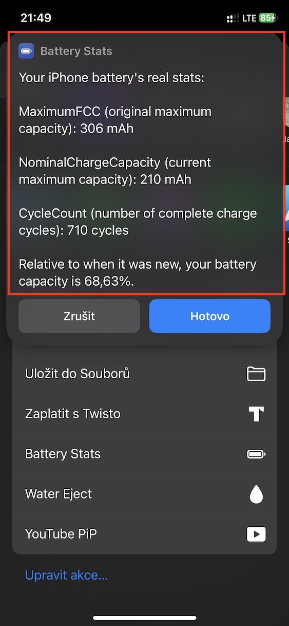 Máte nainstalovanou aplikaci Zkratky? Zobrazuje se v ní po stažení z uvedeného odkazu a přidání zkratka Battery Stats?