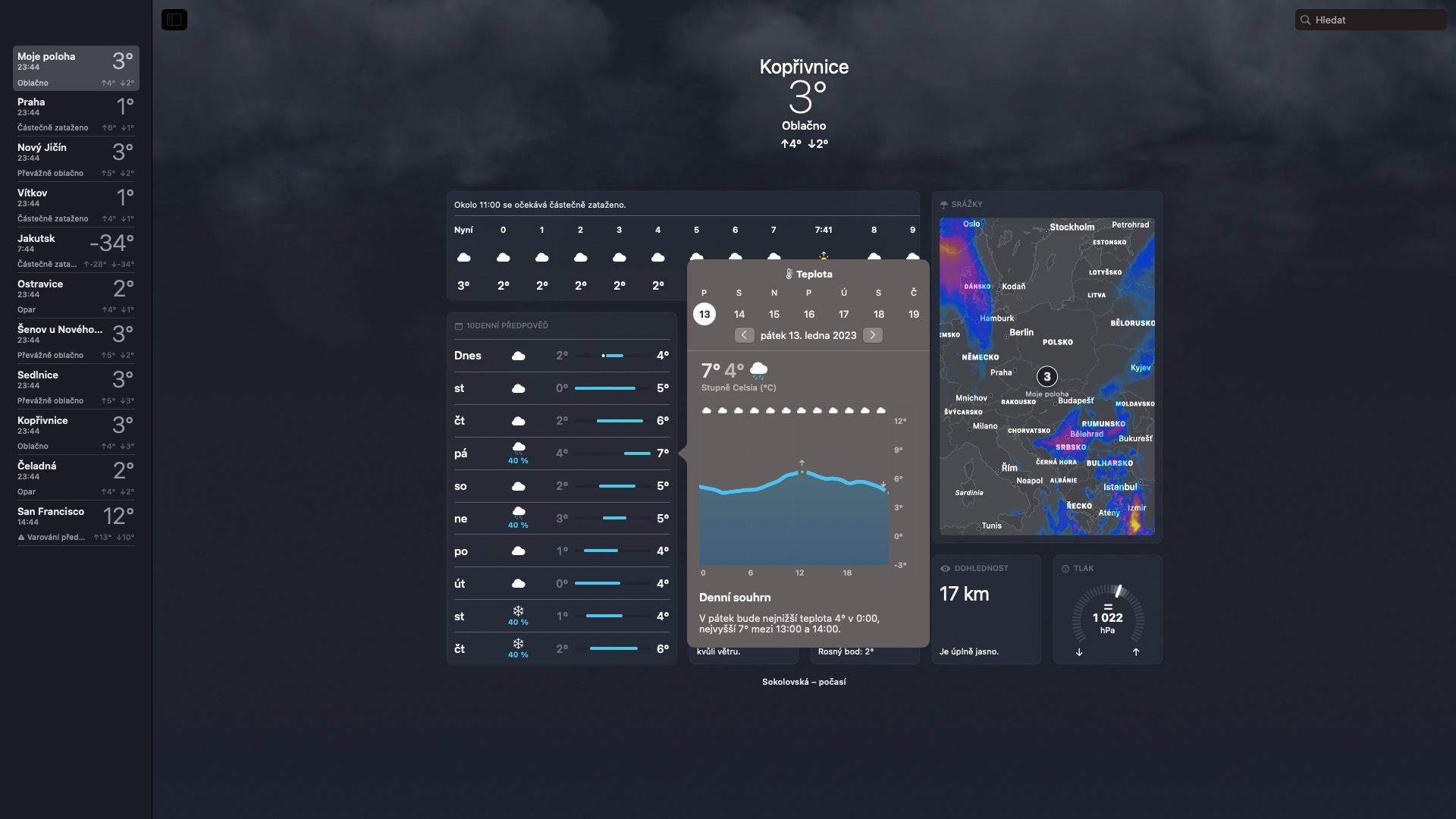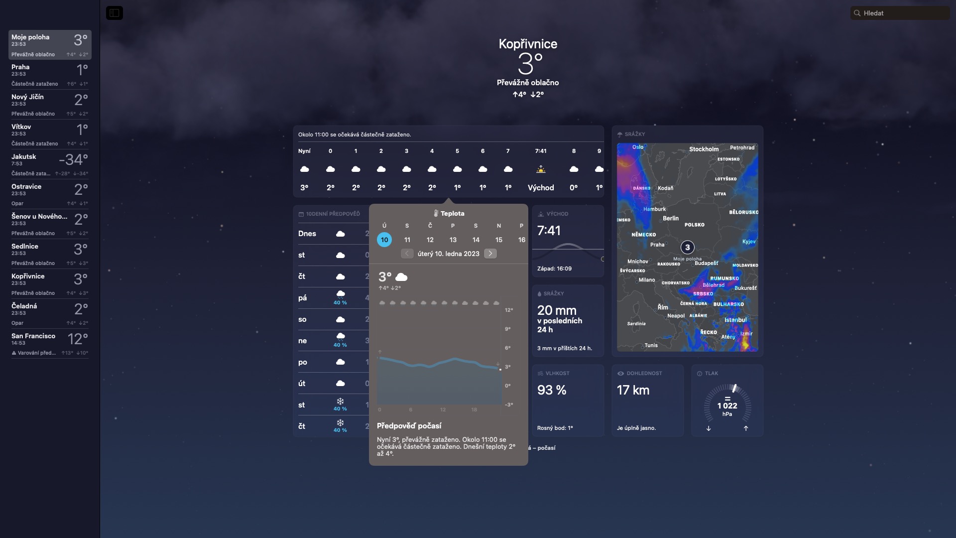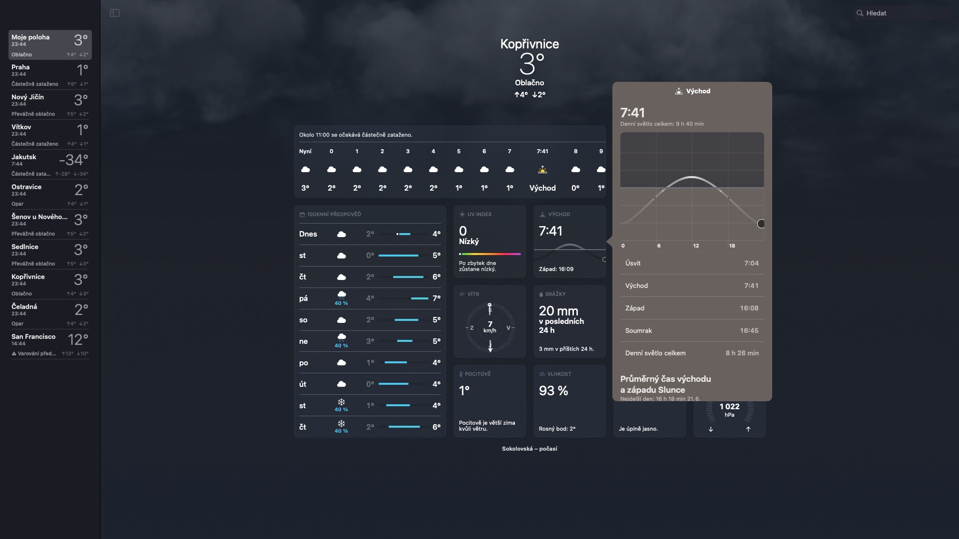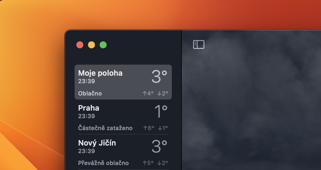 Jak už jsem nakousl v úvodu, tak Počasí má v macOS opravdu úchvatný design, který na větším a kvalitním displeji jablečných počítačů vypadá opravdu skvěle. Pokud aplikaci otevřete, tak si ihned všimnete toho, že se využívá rozhraní s bočním panelem. V tomto bočním panelu se nachází seznam jednotlivých oblíbených měst, včetně dynamického místa v podobě vaší polohy, které se samozřejmě automaticky aktualizuje podle toho, kde se nacházíte. U každého místa v seznamu se zobrazují základní informace v podobě místního času, aktuálního počasí a teplot. V pravém horním rohu okna se nachází textové pole, které slouží pro vyhledávání jednotlivých míst.