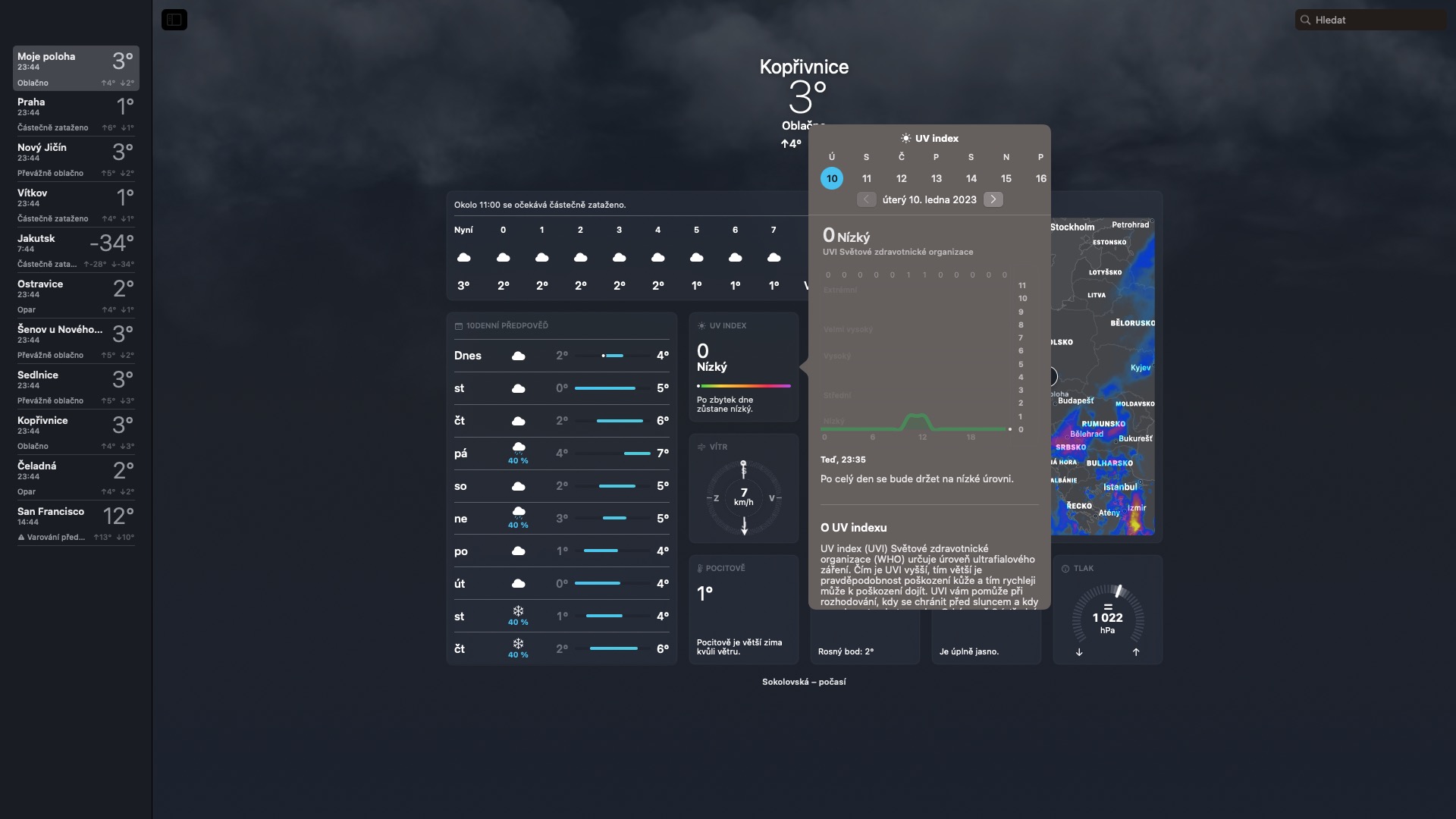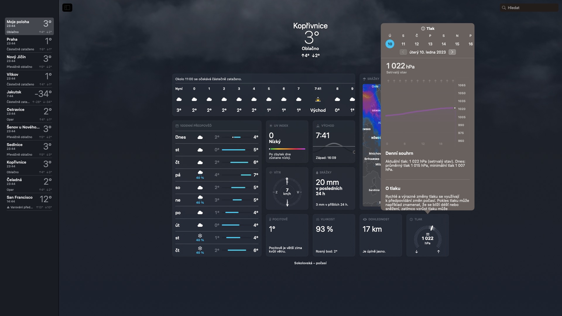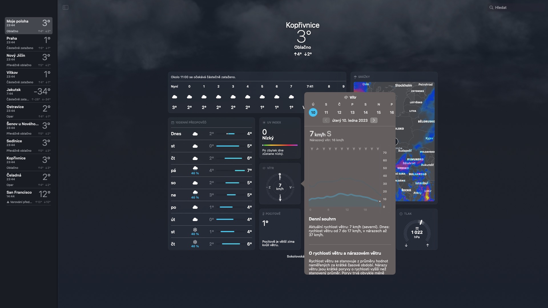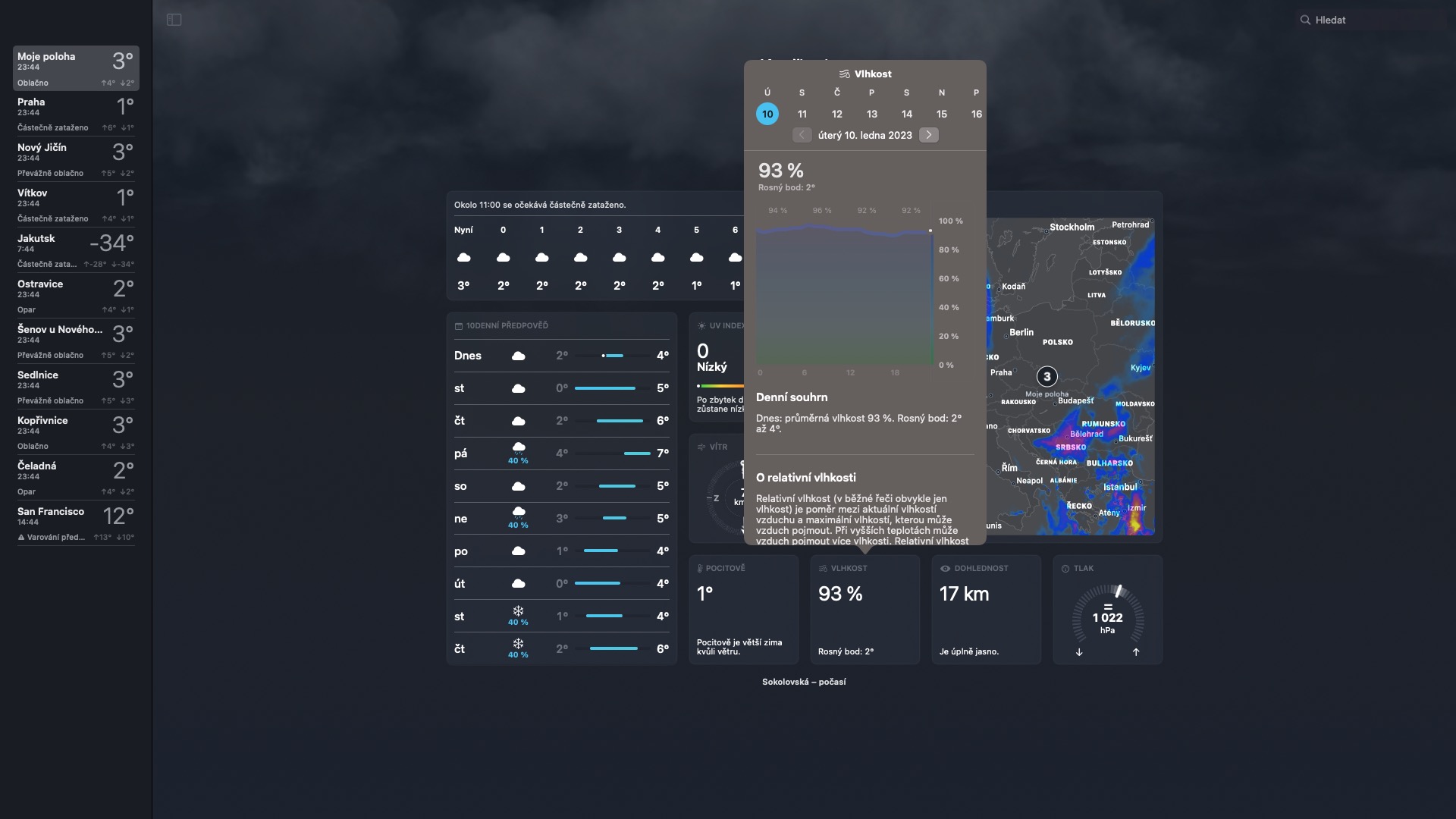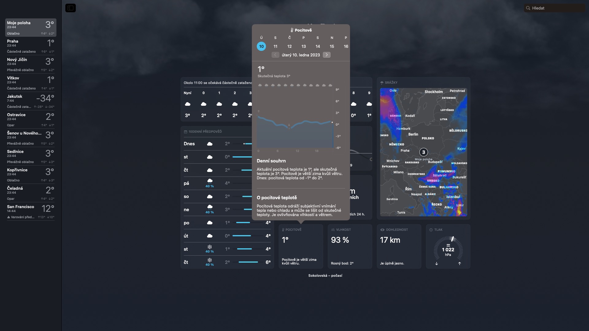 Údaj o teplotě je sice naprosto základní, pokud se však podle něj například oblékáte, tak byste měli vsázet spíše na pocitovou teplotu. O této teplotě najdete informace v dlaždici Pocitově, takže pocitovou teplotu můžete jednoduše srovnat s tou klasickou. V dlaždici se pak ještě zobrazuje důvod, z jakého důvodu je pocitová teplota vyšší či nižší. Po rozkliknutí se opět zobrazí graf s pocitovou teplotou během dne, společně s psaným souhrnem. Pocitová teplota odráží subjektivní vnímání tepla a chladu a je ovlivňována hlavně vlhkostí a větrem.