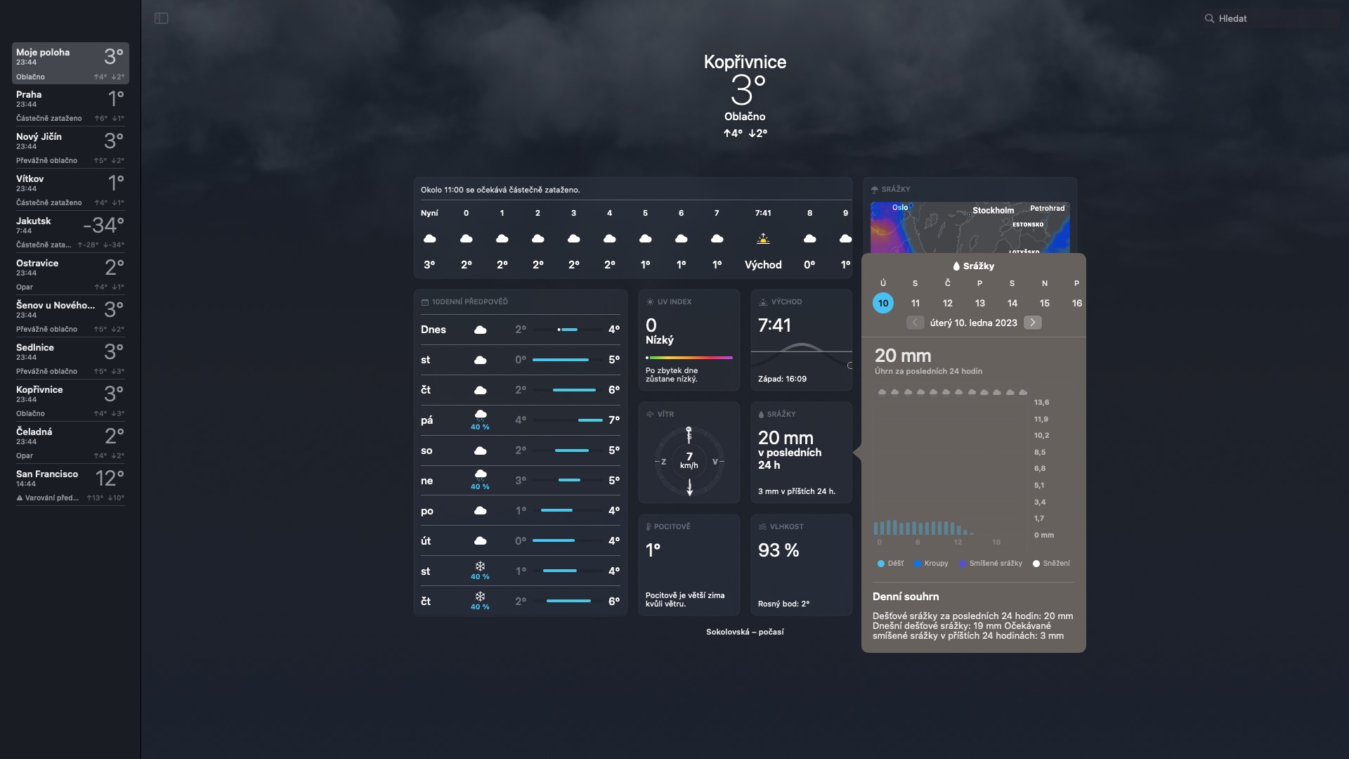 Pro mnohé uživatele jsou taktéž velmi důležité informace o srážkách, které najdete ve stejnojmenné dlaždici. V té se zobrazuje info o počtu napršených milimetrů v posledních 24 hodinách a info a dalším očekávaném dešti. Po rozkliknutí se opět můžete podívat na graf srážek během dne – nechybí rozdělení na déšť, kroupy, smíšené srážky a sněžení. Níže se pak dočtete také o denním souhrnu srážek.