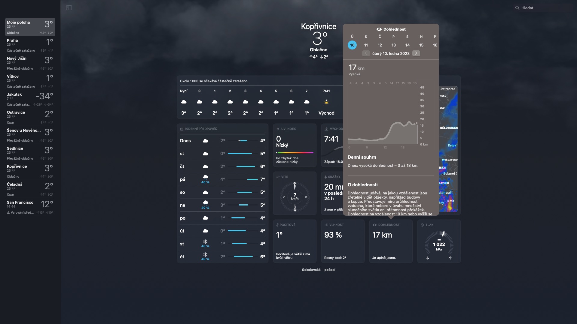 Nechybí mimo jiné ani dlaždice Dohlednost, kde si uživatelé mohou zobrazit údaj v kilometrech o maximální dohlednosti. Po rozkliknutí se opět zobrazí graf s denním průběhem dohlednosti. Níže si můžete taktéž přečíst denní souhrn tohoto údaje. Dohlednost udává, na jakou vzdálenost jsou zřetelně vidět objekty, například budovy a kopce. Představuje míru průhlednosti vzduchu, která nebere v úvahu množství slunečního světla ani přítomnost překážek. Dohlednost větší než 10 kilometrů se považuje za dobrou.