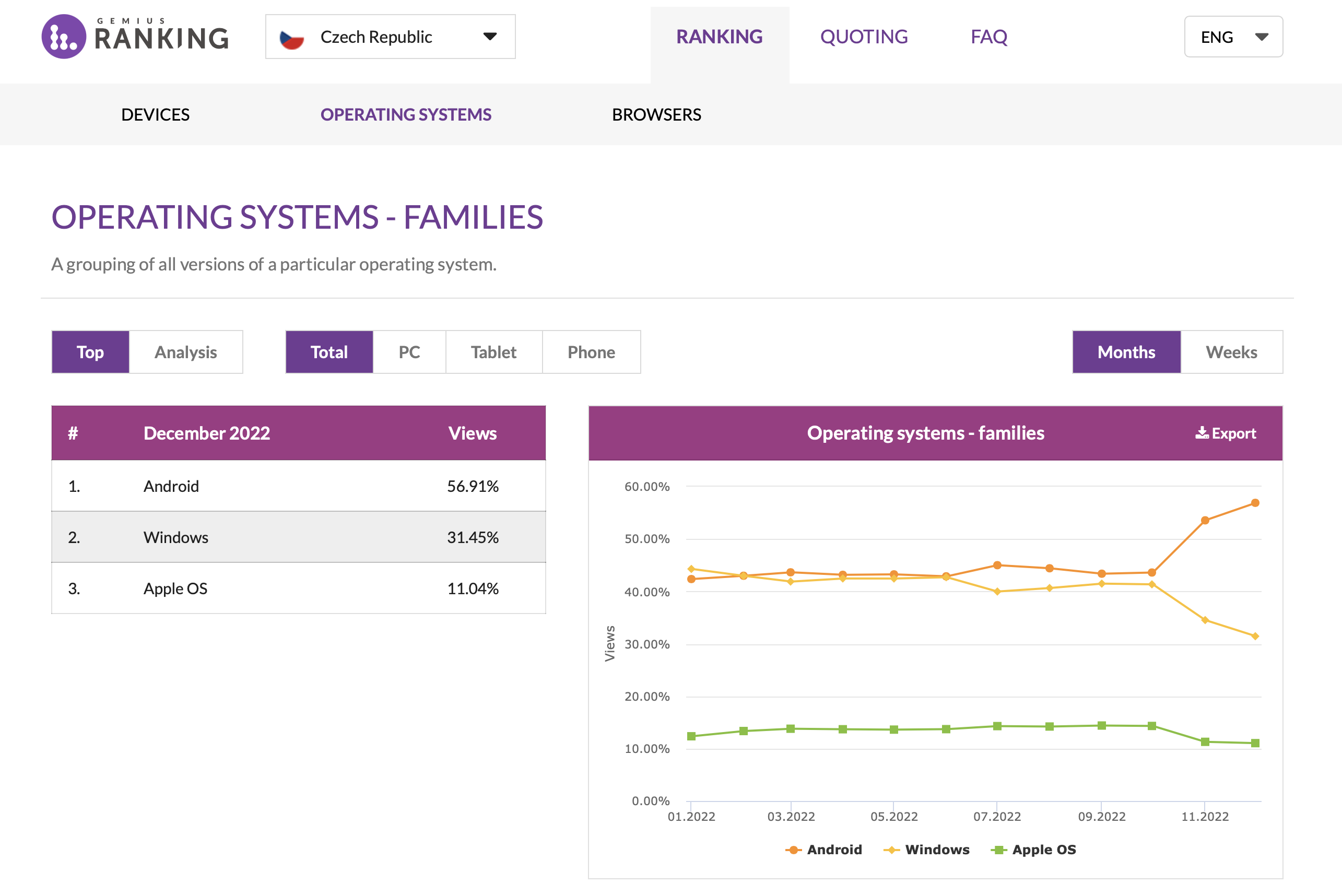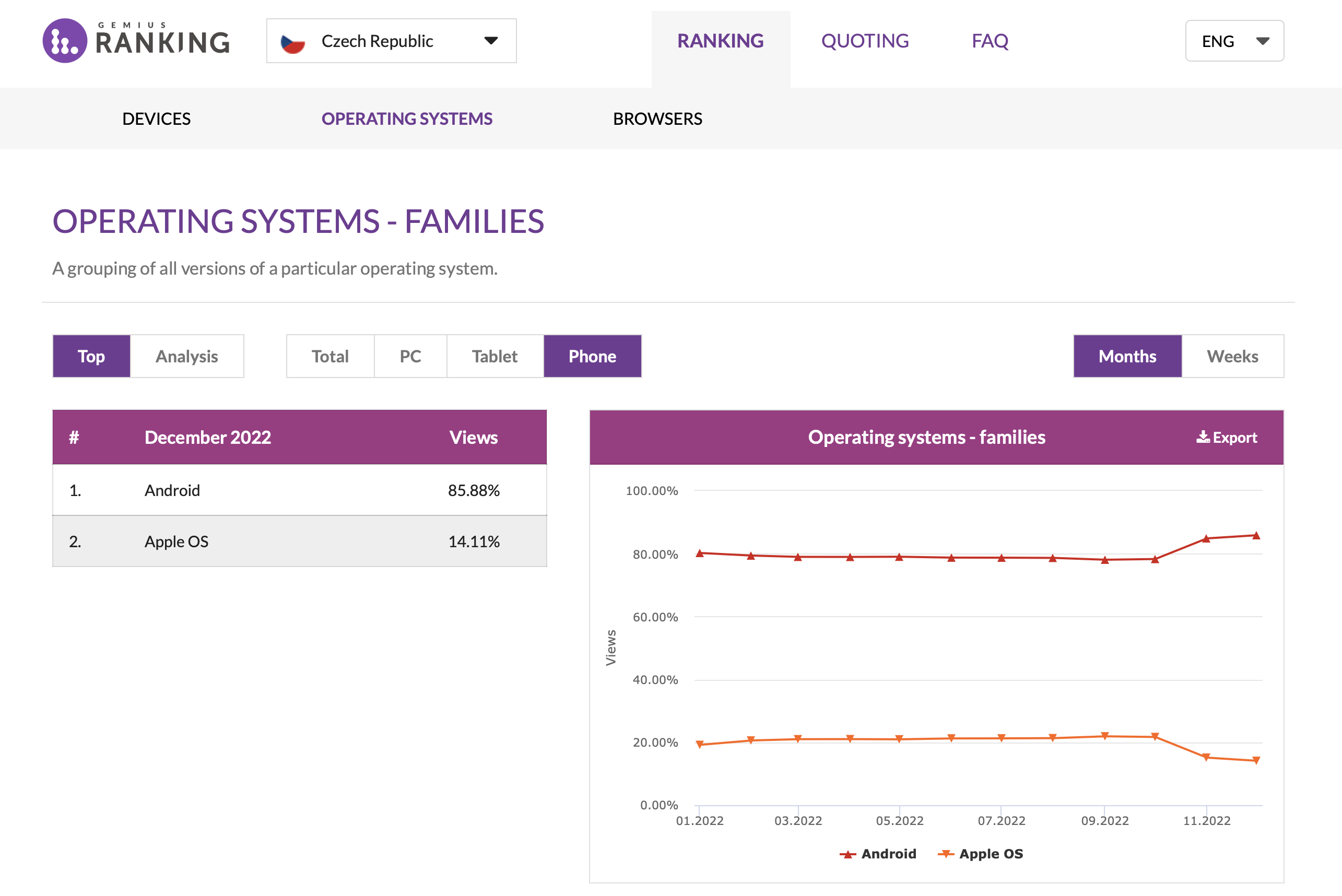 Řijen 2022 byl totiž poslední měsíc, kdy toto pravidlo platilo. V listopadu došlo k dramatickému propadu iOS, který dále pokračoval i v prosinci, což nakonec vedlo k tomu, že se po dlouhých letech, kdy se iOS držel okolo 20% dostal na pouhých 14,11%. Nejzajímavější na tom je fakt, že se iOS dostalo z řijnových 21,69% na pouhých 14,11% během pouhých dvou měsíců. Aktuálně tak v prosinci patřilo Androdiu 85,88% a iOS 14,11% trhu v ČR mezi mobilními telefony.