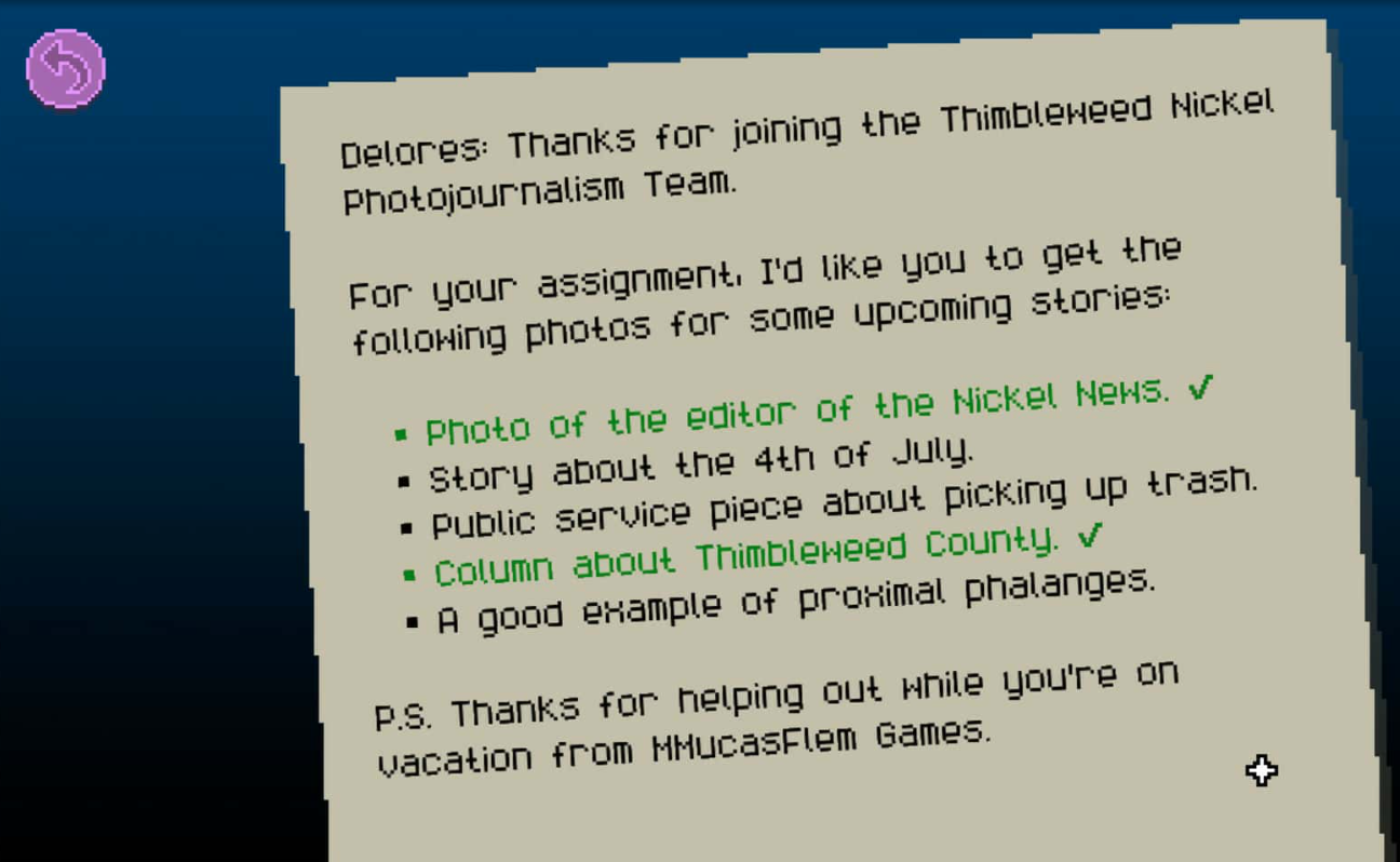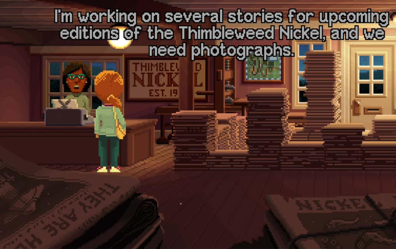 Píše se rok 1988. Vývojářka dobrodružných her Delores Edmundová, která má přestávku ve své práci ve společnosti MMucasFlem Games, se vrátila do Thimbleweed Parku na krátkou dovolenou. Zatímco je doma, přivydělává si jako fotografka pro Thimbleweed Nickel News. Odhalujte zapomenutá podivná tajemství v této zábavné point-and-click adventuře.