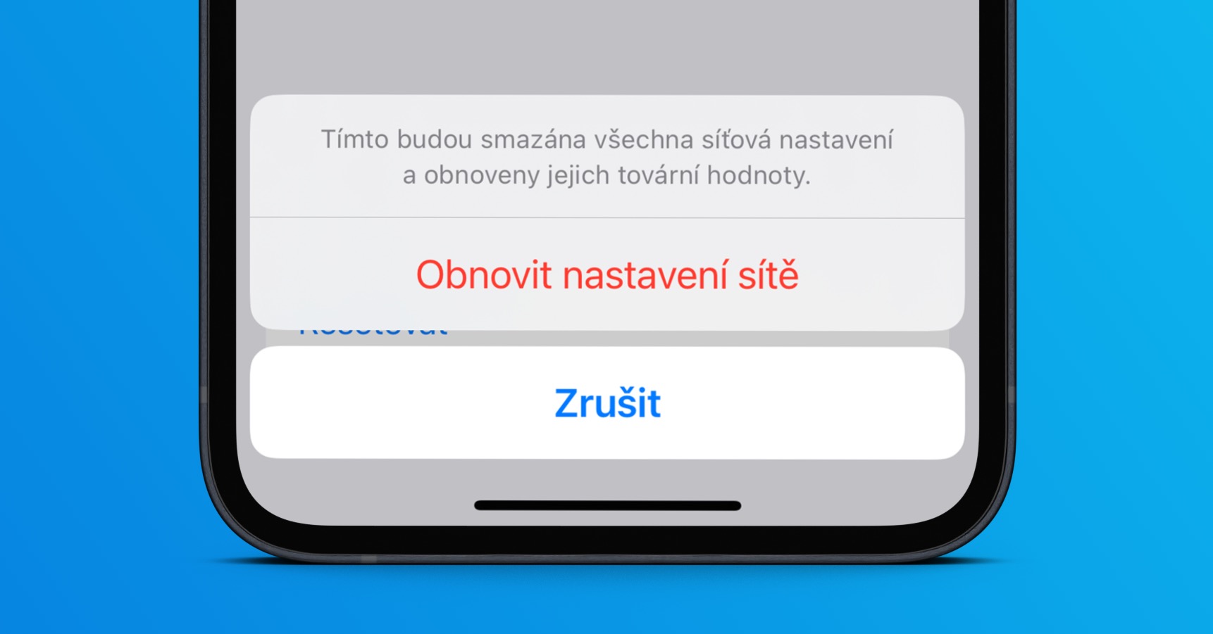 Upozornění: Berte na vědomí, že po provedení resetu síťových nastavení dojde ke kompletnímu obnovení sítě do továrních nastavení. Nepřijdete o žádná data, dojde však k odpojení od všech známých Wi-Fi sítí a Bluetooth zařízení, takže se k nim budete muset znova pomocí hesla připojit, respektive zařízení opětovně spárovat. Zároveň dojde k odstranění informací o VPN a profilech a dalších předvoleb sítě.