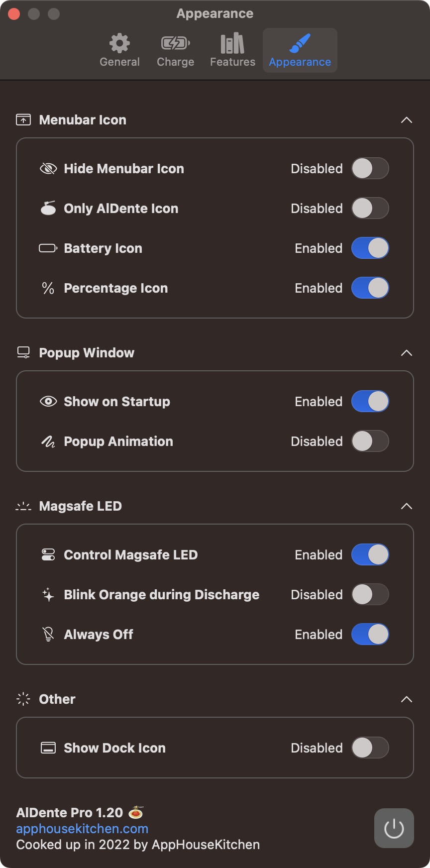 Před nedávnem jsem se ale spojil s vývojáři aplikace a rozhodli jsme se, že vám přinesu článek, ve kterém se podíváme na plnou verzi zmíněné aplikace v podobě AlDente Pro, která nabízí několik zajímavých a využitelných funkcí navíc. Hned na začátek mohu uvést, že si v plné verzi můžete změnit ikonu v horní liště na klasickou baterii s ukazatelem procent, takže ji můžete vyměnit za tu systémovou. Přímo v horní liště skrze ikonu navíc můžete ručně nastavit, aby se baterie dobila do 100 %, což se hodí například v případě, že se chystáte odejít. Kromě toho můžete nechat Mac také opětovně vybít na určitou kapacitu a případně jednoduše nastavit, do kolika procent se má jablečný počítač nabít. Pokud máte novější MacBook, tak můžete také přenastavit diodu MagSafe konektoru, u které lze například nastavit kompletní vypnutí, což jsem osobně ihned využil.