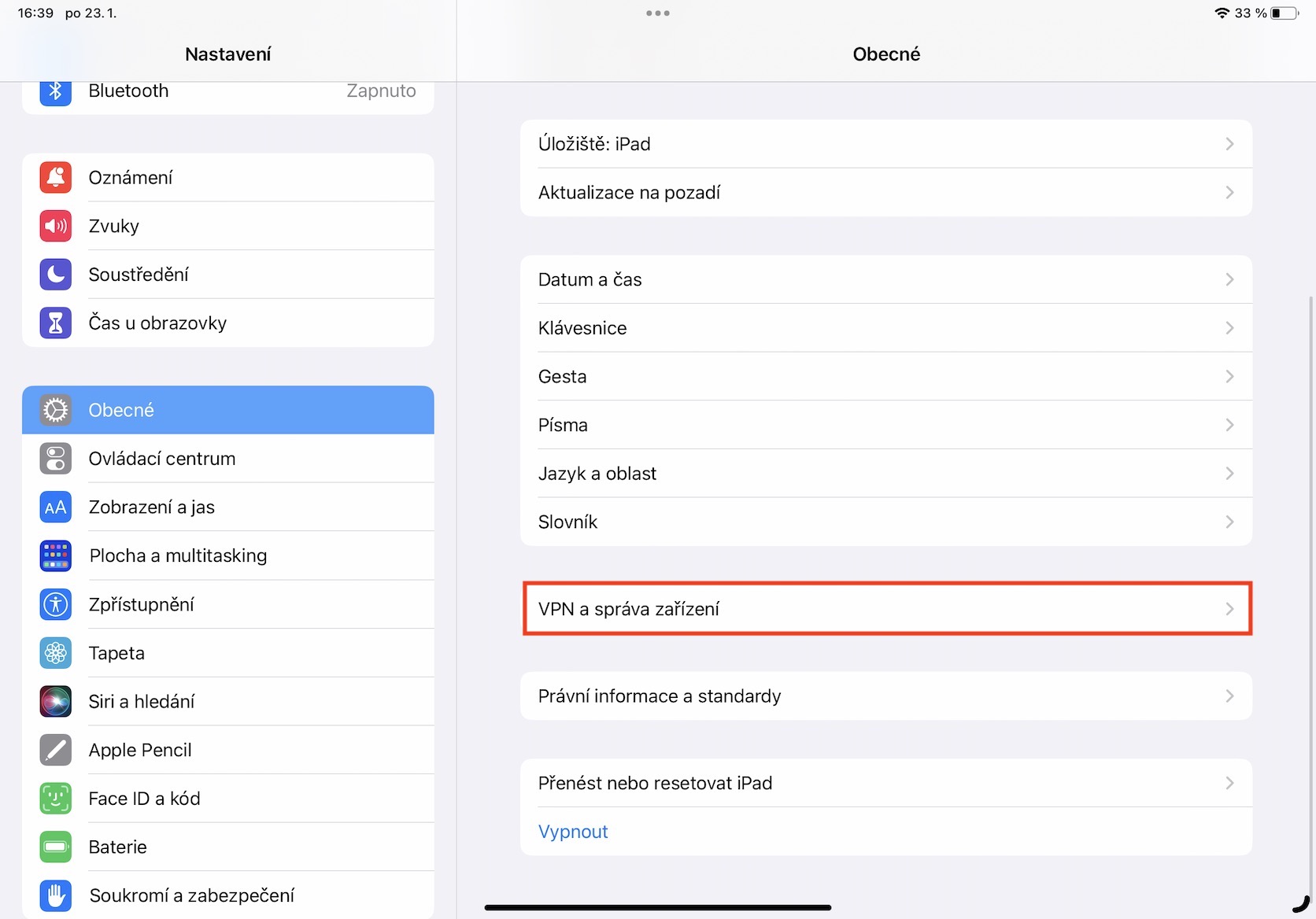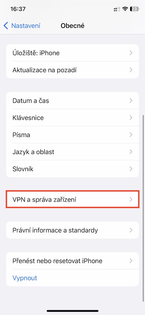3. Následně sjeďte úplně dolů a rozklikněte VPN a správa zařízení.