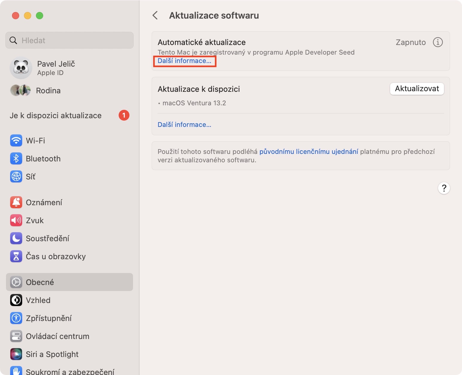 6. Dále pod textem Tento Mac je zaregistrovaný v programu Apple Developer Seed stiskněte Další informace…