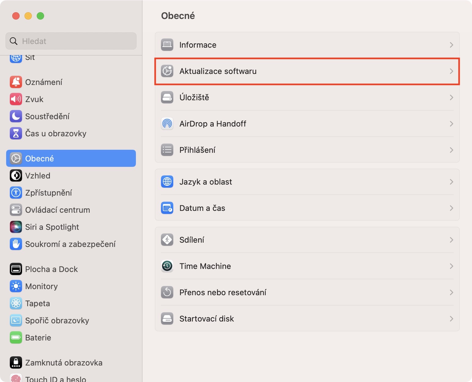4. Jakmile tak učiníte, přejděte do sekce Aktualizace softwaru.