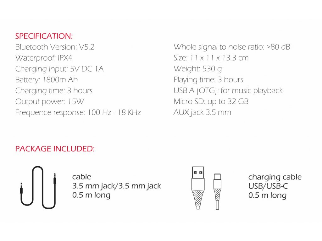 Stejně jako v případě většiny ostatních produktů Swissten je i reproduktor Sound-X zabalen v tradiční bílo-červené krabici. Na její přední straně najdete vyobrazený samotný reproduktor, společně se základními informacemi, na jedné z bočních stran pak specifikace s fotkou reproduktoru v akci. Zadní strana je prakticky kompletně věnována návodu k použití v několika jazycích a informacím. Po otevření krabičky z ní stačí reproduktor Sound-X vytáhnout, a to společně se dvěma půlmetrovými kabely, kdy jeden nabízí z obou stran 3,5mm sluchátkový konektor pro drátový přenos zvuku, druhý je pak USB-A – USB-C a slouží samozřejmě k nabíjení. Nechybí ani malá knížečka v podobě manuálu v češtině a angličtině.