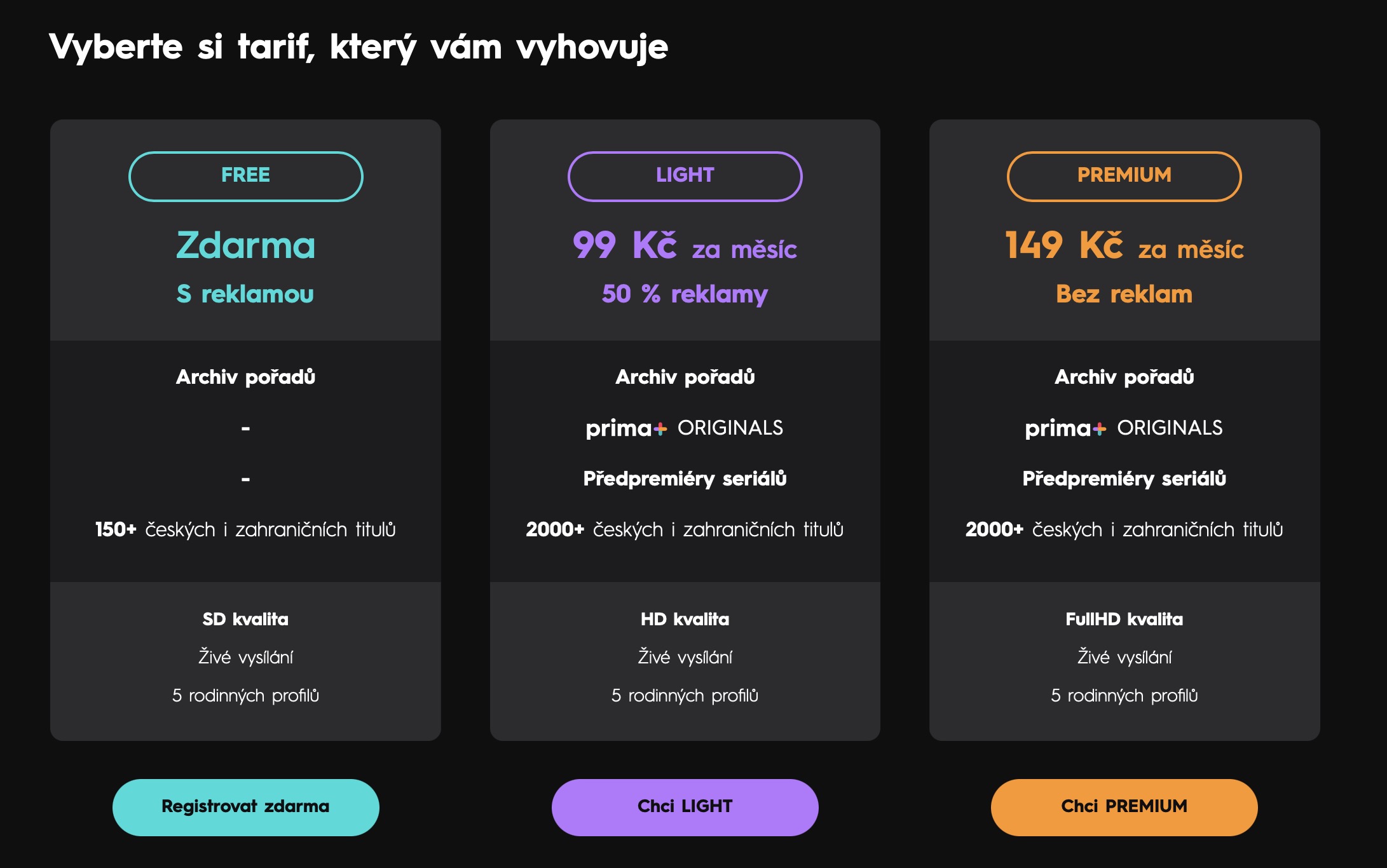 Streamovací služba Prima+ je dostupná celkem ve třech tarifech předplatného, konkrétně pak v tarifu Free, Light a Premium. Tyto tarify nabízí následující: