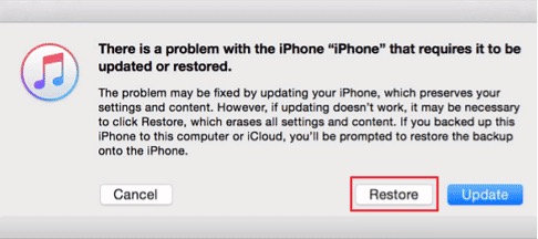 Krok 2: Otevřete iTunes a ihned se vám zobrazí vyskakovací okno, které informuje o tom, že iPhone může mít problém, kvůli čemuž potřebuje aktualizaci či obnovení. Klepněte na možnost týkající se obnovení a následně vaši volbu potvrďte opětovným klepnutím. iTunes se poté postará o obnovení iPhone do továrního nastavení.