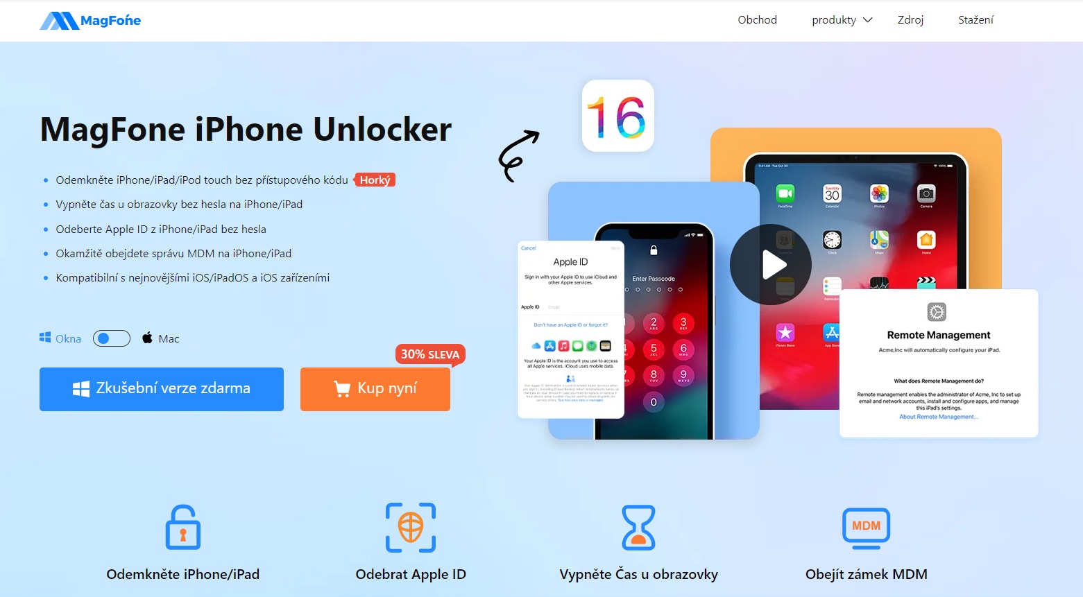 - Odemčení MDM limitací na iPhonu a iPadu bez znalosti hesla a ztráty dat