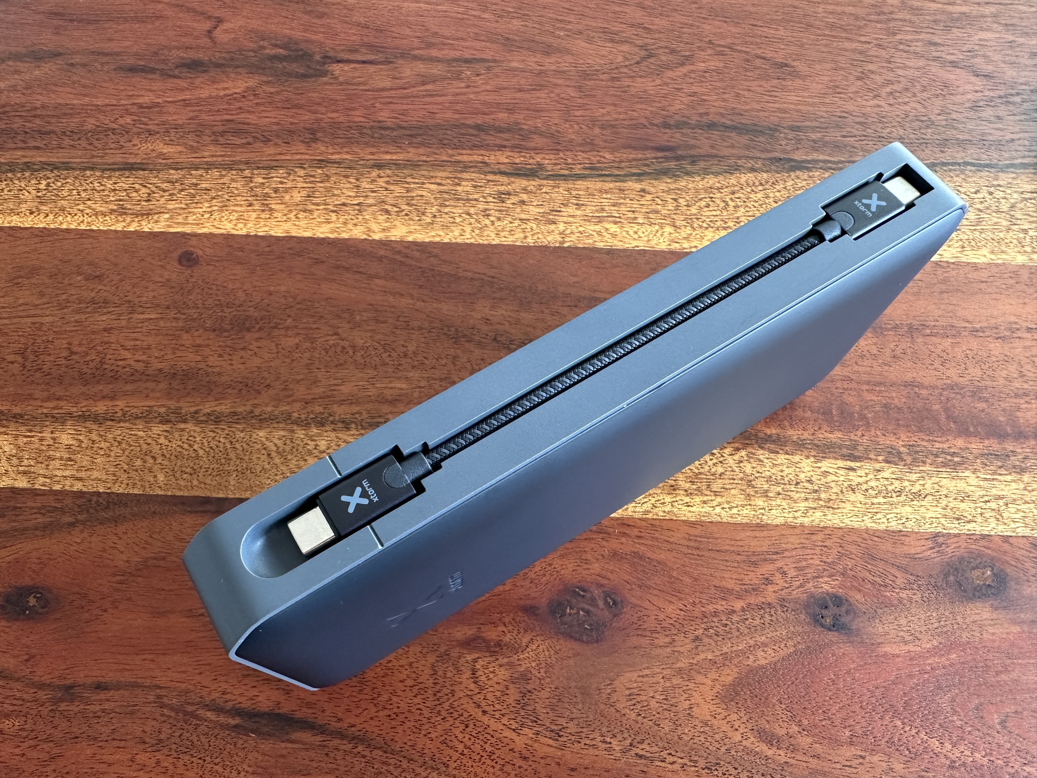 Kromě výkonu USB-C portů je pak důležitá také samotná kapacita baterie uvnitř powerbanky, ta má kapacitu 24 000 mAh, ovšem při takto výkonné powerbance je mnohem důležitějším údajem, kolik watt hodin nabízí a to je v tomto případě 89 Wh. Mezi další vychytávky kromě výkonu a kapacity patří také integrovaný kabel, který je připevněn k tělu powerbanky pomocí magnetu. Jedná se o krátký 15 cm dlouhý USB-C na USB-C kabel, pomocí kterého můžete jak dobíjet powerbanku, tak i zařízení přímo z ní. Pokud navíc powerbanku zrovna nabíjíte, můžete ji i nadále používat k nabíjení dalších zařízení s tím, že energie je pak distribuována podle odběru jednotlivých zařízení. Celé tělo powerbanky je vyrobeno z recyklovaného plastu a k balení jsou požité taktéž recyklované materiály.