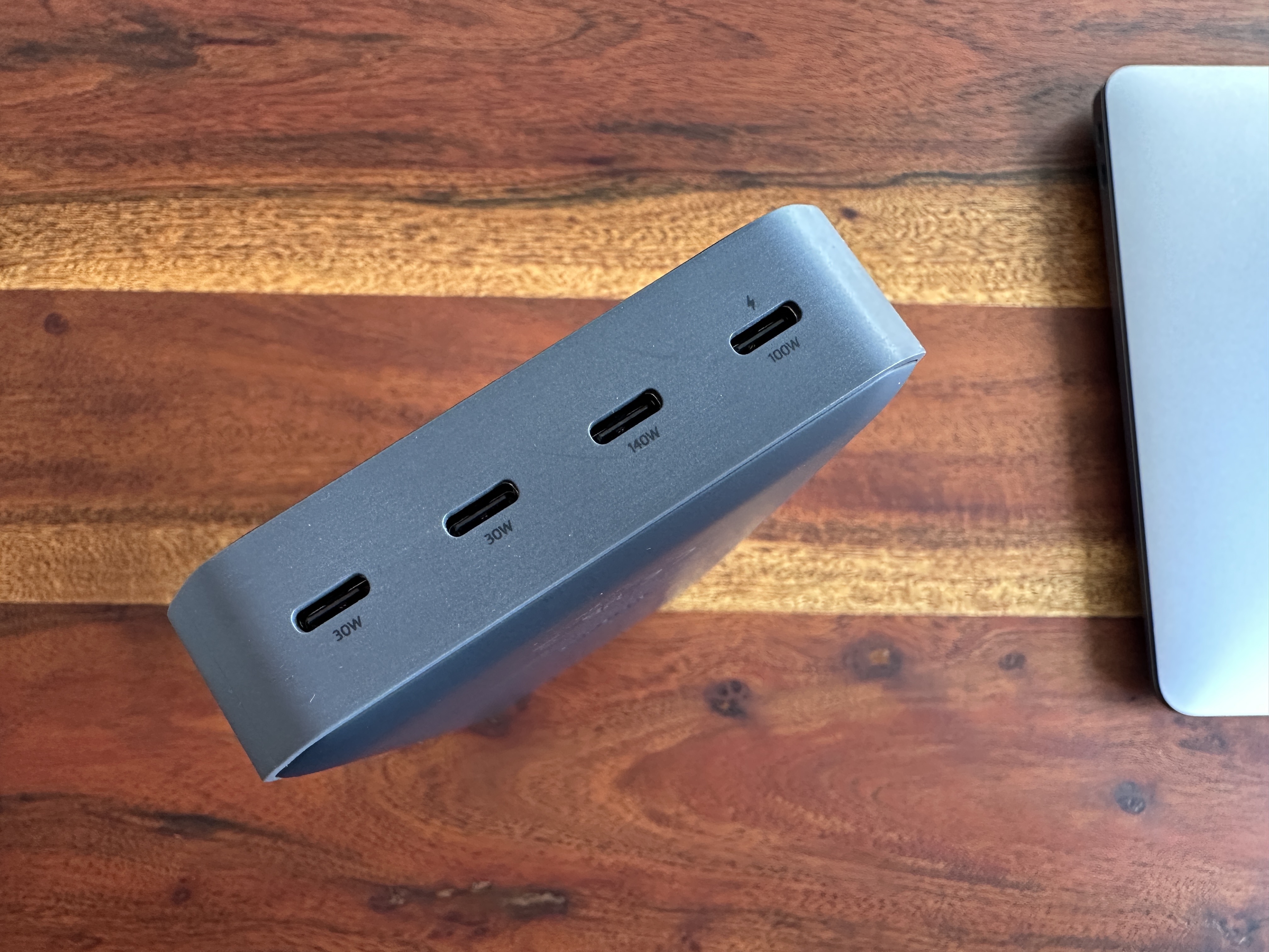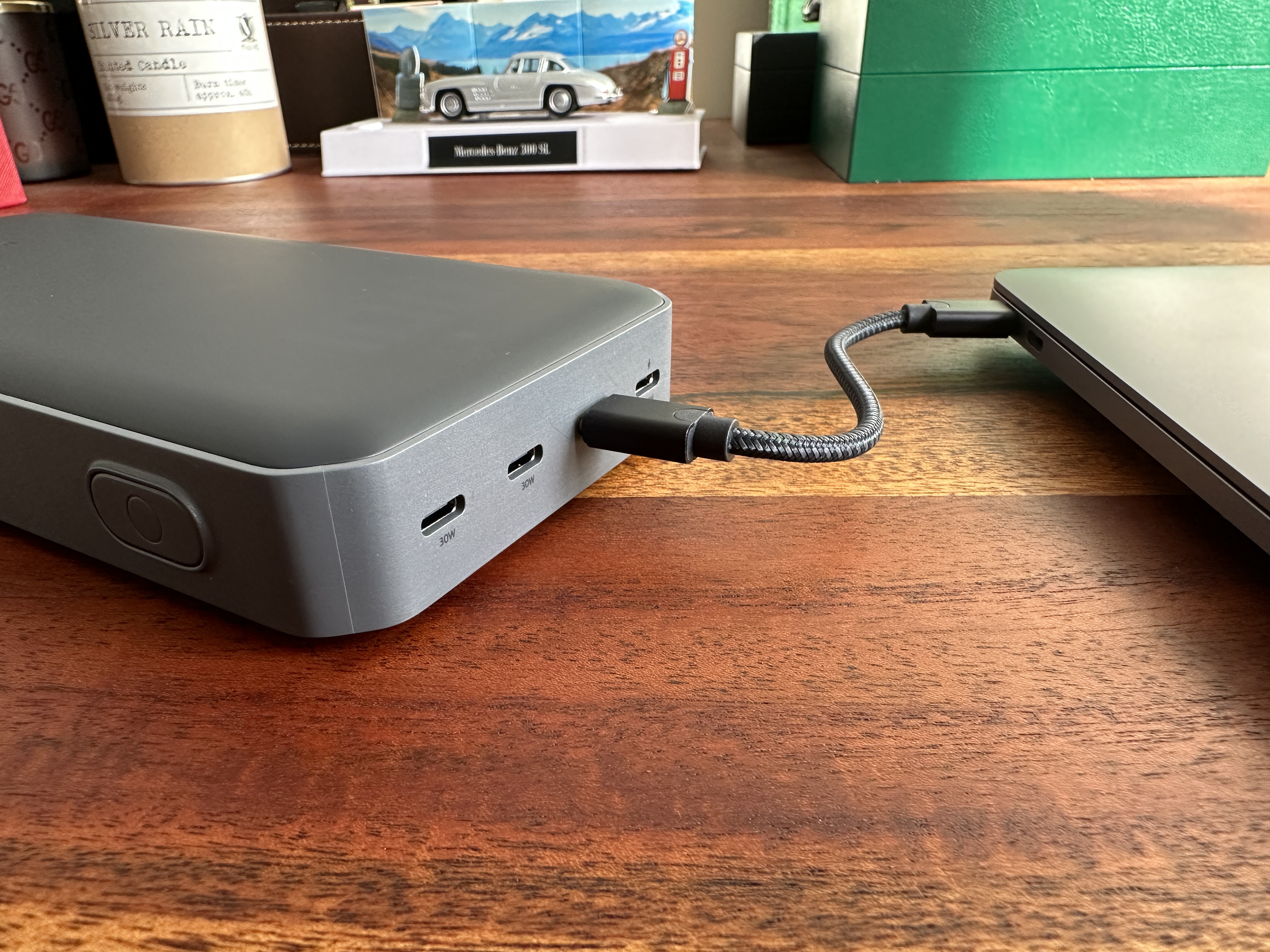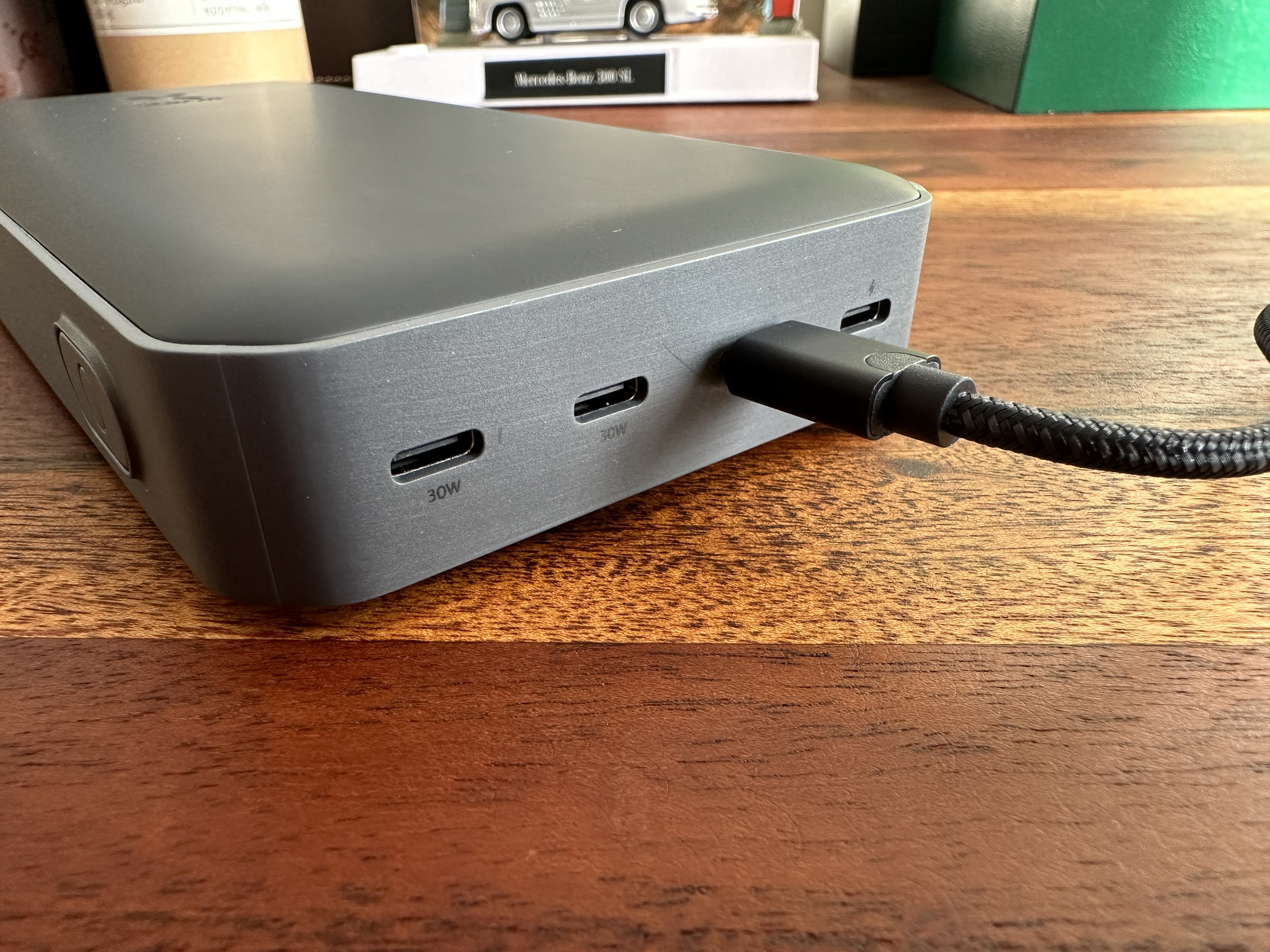 To, čím je tato powerbanka skutečně výjimečná oproti většině ostatních je, že nabízí USB-C s výkonem 140W, díky čemuž je možné nabíjet MacBooky a další zařízení, která vyžadují vysokovýkonné nabíječky. Powerbanka disponuje 4 USB-C porty, z nichž všechny čtyři slouží na nabíjení dalších zařízení, jeden lze pak využít také pro nabíjení samotné powerbanky. Pro nabíjení svých zařízení můžete použít 2x USB-C s 30W, 1x USB-C s 100W a 1x USB-C s 140W, pokud budete vyyužívat všechny čtyři USB-C porty současně, pak je jejich společnýc výkon 150W. Pokud se rozhodnete pouze pro jeden s označením 140W, pak skutečně dostáváte výkon 140W. Pro nabíjení powerbanky slouží USB-C port se 100W, díky kterému se powerbanka z 0% na 100% nabije za 90 minut.