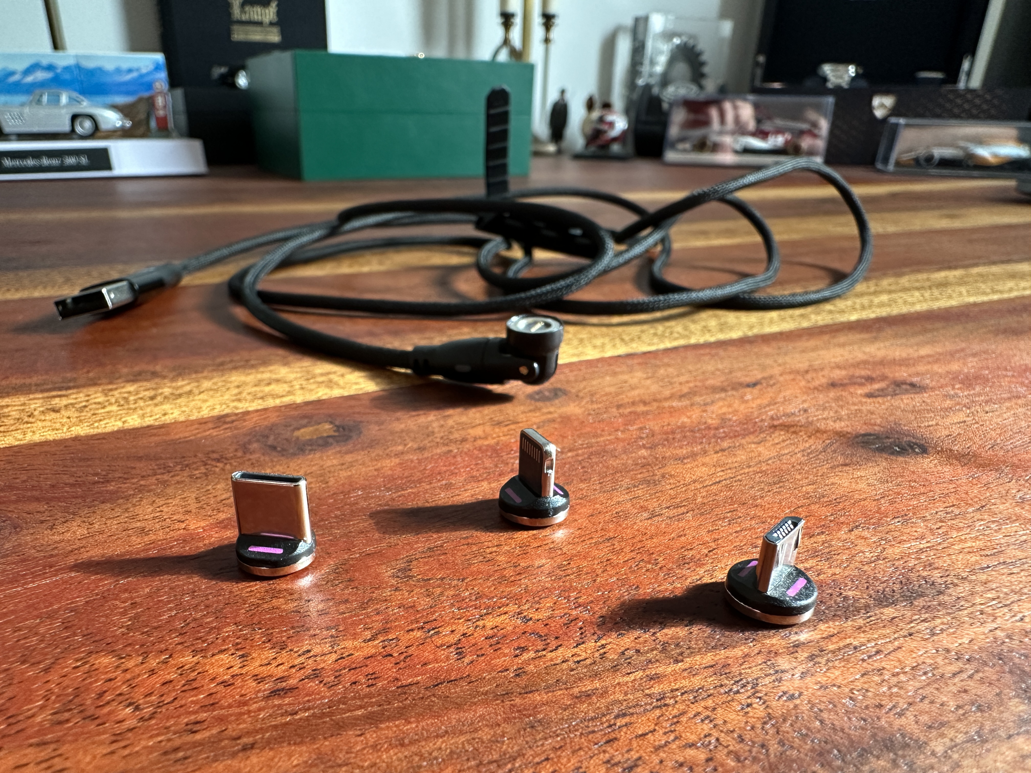 Právě na tento magnet pak můžete připojit trojici koncovek, které najdete v balení. Konkrétně se jedná o USB-C, Lightning a USB Micro-B. Vše pak v praxi vypadá tak, že si jednotlivé koncovky zasunete do nabíjecích portů svých zařízení a jakmile je potřebujete nabíjet, stačí je přiblížit ke kabelu a ten už se magneticky připojí ke koncovce a začne nabíjení. Koncovky drží v portech velmi pevně a tak odpojení probíhá jednoduše tím, že zatáhnete za kabel a magnety se od sebe odpojí, přičemž koncovka zůstane připojena v portu. Koncovky, které strkáte do portu, jsou velmi malé a u drtivé většiny zařízení si ani nevšimnete toho, že je máte v portu zapojené. Osobně jsem je nechal zapojené v MacBooku Air a DualSense Edge trvale s tím, že k oběma těmto zařízením jen přiložím kabel, ten se magneticky připojí a začne nabíjení. Pokud nemáte v autě bezdrátové nabíjení, je pak ideální magnet spolu s kabelem právě do auta, kde nemusíte příliš řešit zapojování a připojování a zkrátka jen přiblížíte telefon ke kabelu a ty se spojí.