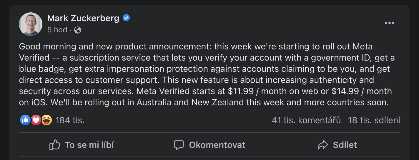Mark Zuckerberg, generální ředitel společnosti Meta, pod kterou patří Facebook, Instagram nebo například WhatsApp dnes na svém oficiálním profilu na Facebooku oznámil, že ověření účtu bude nově placené, podobně jako je tomu u Twitteru. Placení za ověření, tedy za modrou fajfku u profilu se bude týkat jak Instagramu, tak Facebooku a nabídne mimo jiné přímý přístup k zákaznické podpoře. Předplatné nese název Meta Verified a bude stát 11,99$ měsíčně, pokud jej zakoupíte na webu, případně 14,99$, pokud si jej zkaoupíte v rámci předplatných na iOS zařízení. Zvýšená cena na iOS odráží 30% poplatek, který od vývojářů vybírá Apple v rámci App Store.