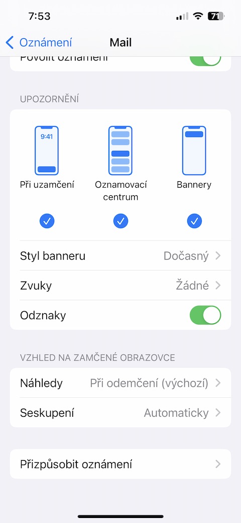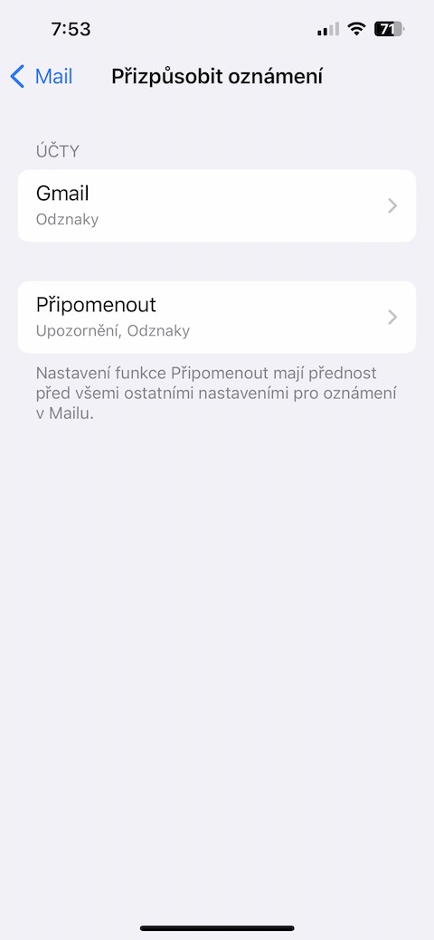 Pokud nechcete, aby byl váš iPhone zahlcený notifikacemi z nativního Mailu, můžete si je plně přizpůsobit. Na iPhonu spusťte Nastavení -> Mail, zamiřte zcela dolů a klepněte na Přizpůsobit oznámení. Vyberte účet, u kterého chcete přizpůsobit notifikace, a proveďte příslušná nastavení. Zde si můžete přizpůsobit také notifikace pro e-maily z VIP skupiny.