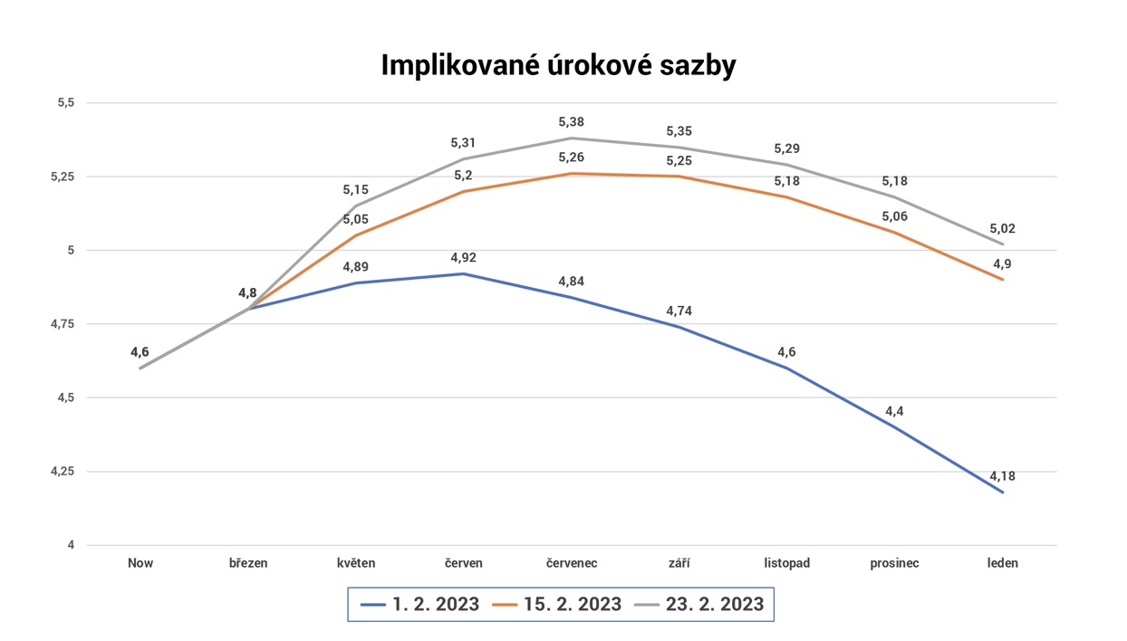 V recesi však věřil do začátku února také trh s dluhopisy. Implikovaná křivka naceňovala, že sazby v druhé polovině roku klesnou o 1 %. Pokles o 1 %, to není žádné hladké přistání. Dnes už trh očekává kosmetické snížení sazeb o 25 bazických bodů, což naznačuje, že pochopil odhodlání Fedu neustoupit inflaci. Stejně tak pochopil, že inflace nebude padat dolů rovnou čarou, což je vidět i na dalších křivkách inflačního očekávání, které rostly za poslední týdny výše.