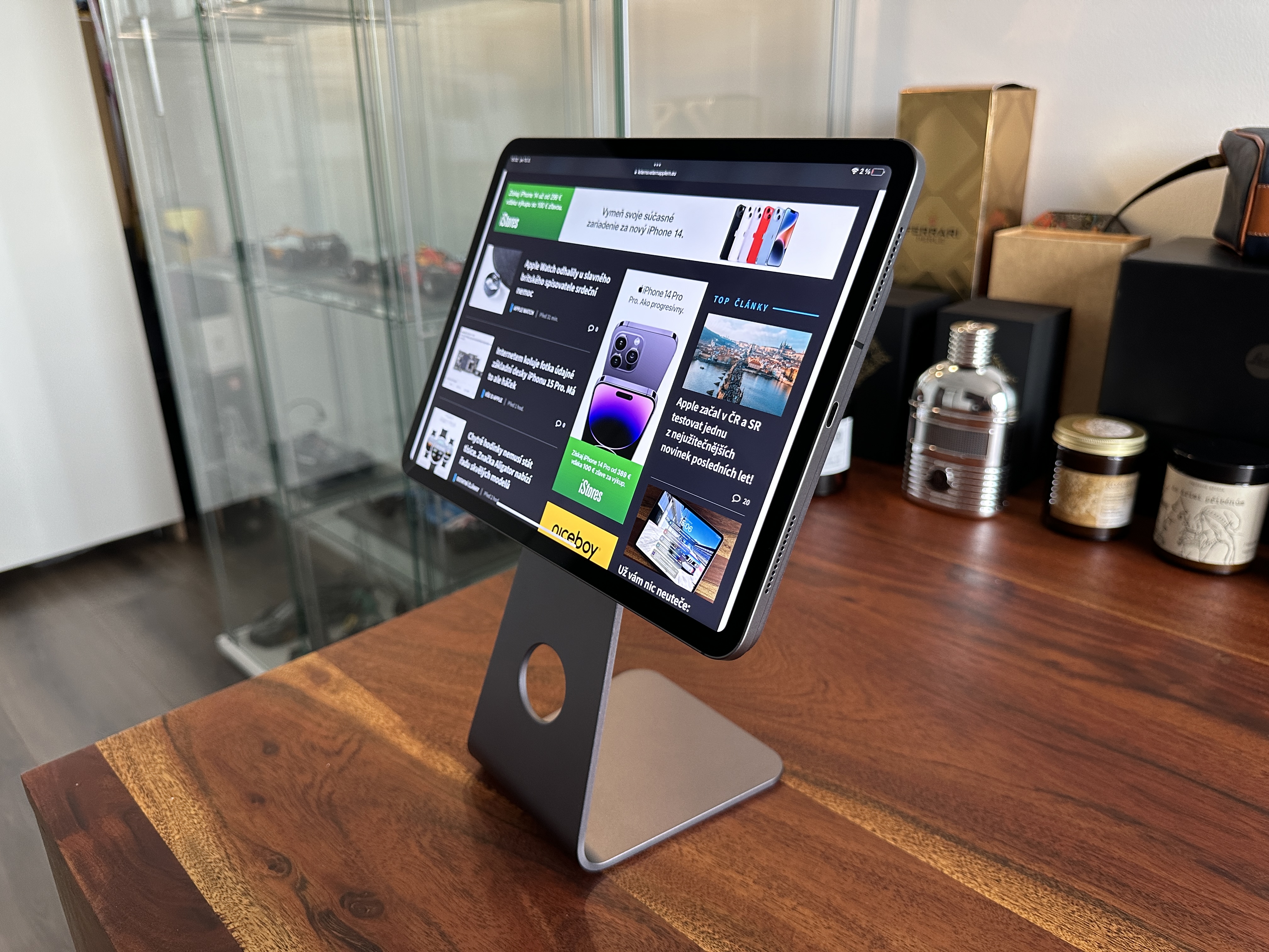 Prvním produktem, na který se podíváme, je stojánek na iPad s označením Epico Magnetic Stand. Je kompatibilní s každým iPadem, který má zadní magnetový systém (2018 iPad Pro a novější) a defakto s ním proměníte svůj iPad v iMac. Stačí, abyste přiložili k stojánku iPad a ten se magneticky uchytí, pak už jen stačí stojan nastavit přesně, jak potřebujete. Přizpůsobit si můžete náklon a to po obou osách.