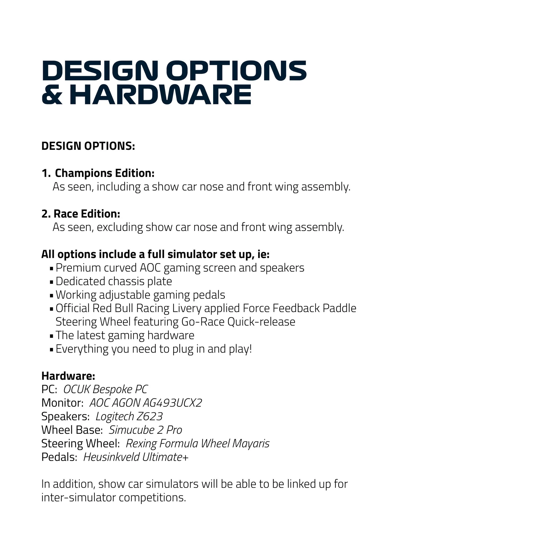 Pro výrobu tohoto simulátoru byla totiž použita oficiální CAD data Oracle Red Bull Racing z monopostu RB18 pro sezónu 2022. Na celý vývoj a následnou výrobu dohlížel samotný Red Bull a použil stejné postupy, jako při výrobě skutečného monopostu, jen s aerodynamikou si tentokrát nemusel Adrian Newey příliš lámat hlavu. Simulátor váží 160 kilogramů. Jeho délka je 4,1 metru, šířka 1,4 metru a výška 1,2 metru.