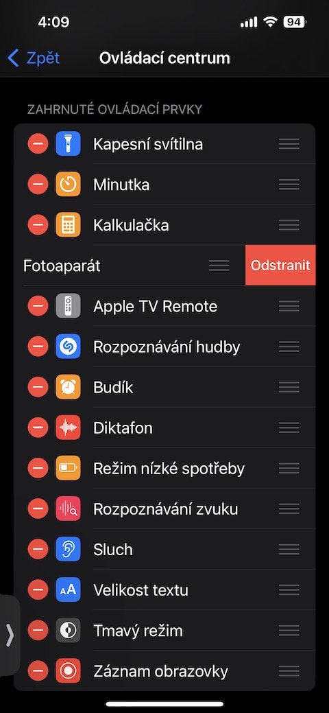 Pokud jste čerstvým majitelem iPhonu nebo jste si dosud Ovládacího centra příliš nevšímali, určitě se vám bude hodit postup, jak přidat položky do Ovládacího centra. Spusťte na iPhonu Nastavení a klepněte na Ovládací centrum. V sekci Zahrnuté ovládací prvky najdete položky, které se již nachází v Ovládacím centru na vašem iPhonu. Pro odstranění vybrané položky klepněte na červené kolečko nalevo od jejího názvu a potvrďte klepnutím na Odstranit. Pokud chcete změnit pořadí jednotlivých položek, dlouze podržte tři vodorovné linky napravo od názvu vybrané položky a jednoduše panel s položkou přetáhněte na požadovanou pozici. Když v nastavení Ovládacího centra zamíříte až zcela dolů, najdete zde nabídku dalších ovládacích prvků. Pro přidání vybraného prvku do Ovládacího centra klepněte na zelené kolečko se znaménkem „+“.