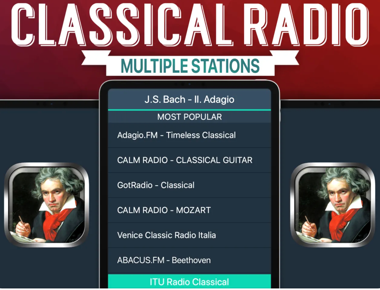 Jak název napovídá, aplikace Classical Radio+ nabízí výběr těch nejlepších internetových rádií, přehrávajících klasickou hudbu. Disponuje funkcí přehrávání na pozadí a nabízí možnost výběrů z nejrůznějších kanálů. Nejedná se tedy o streamovací službu jako takovou.