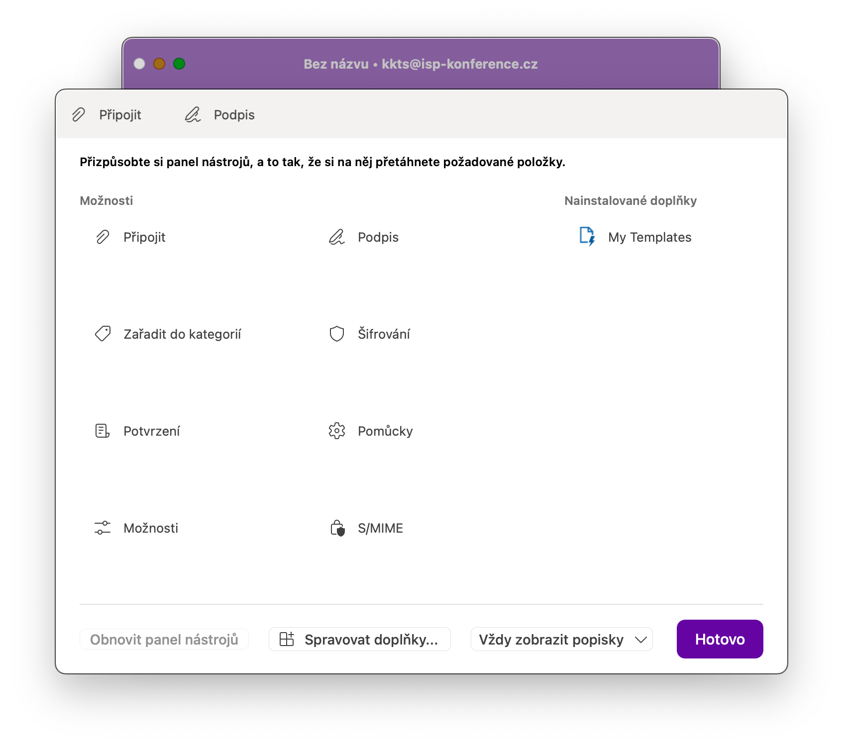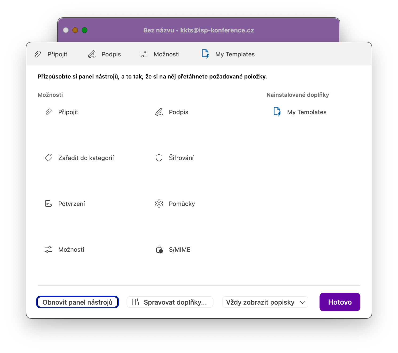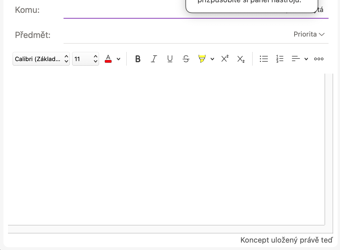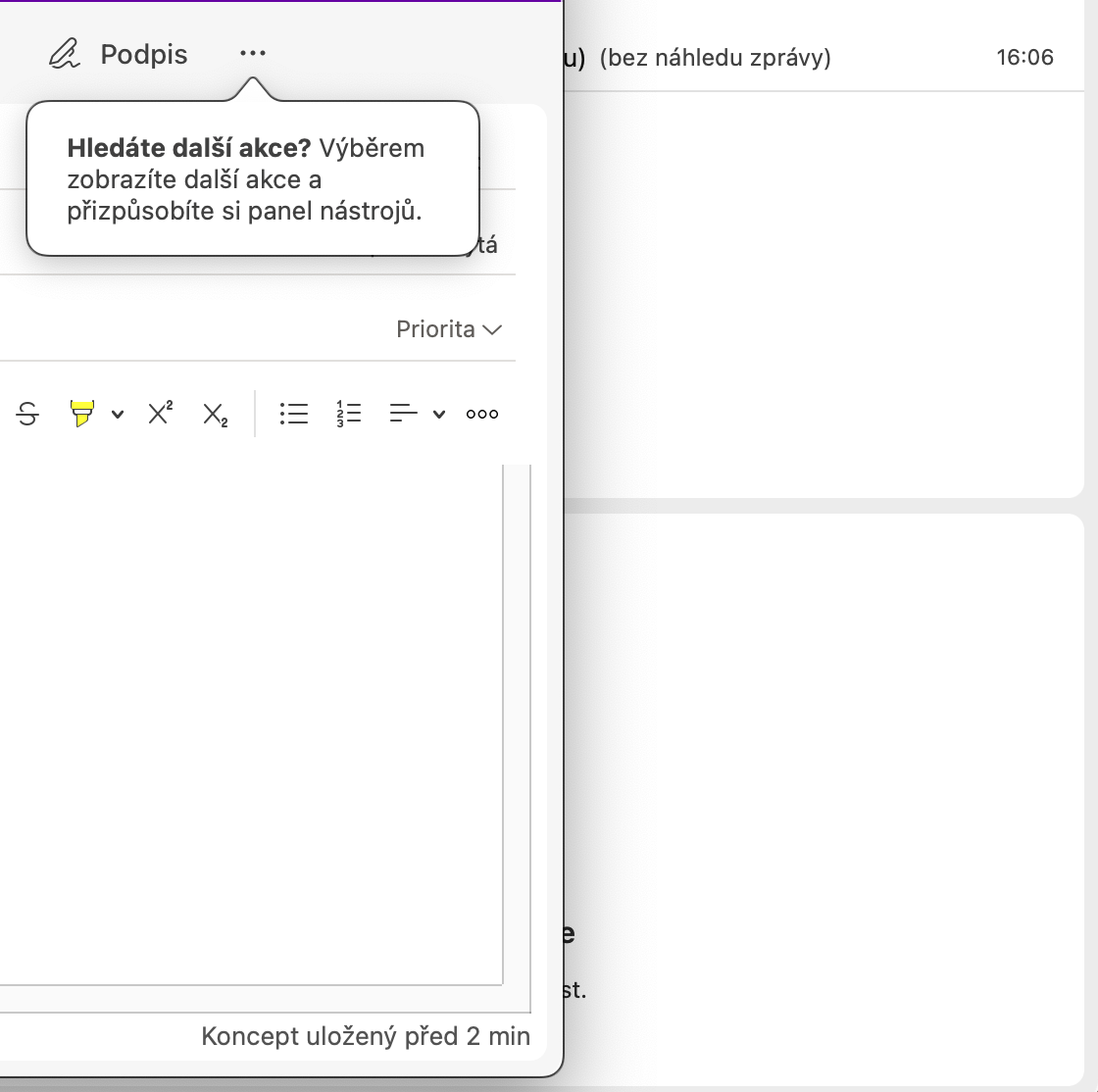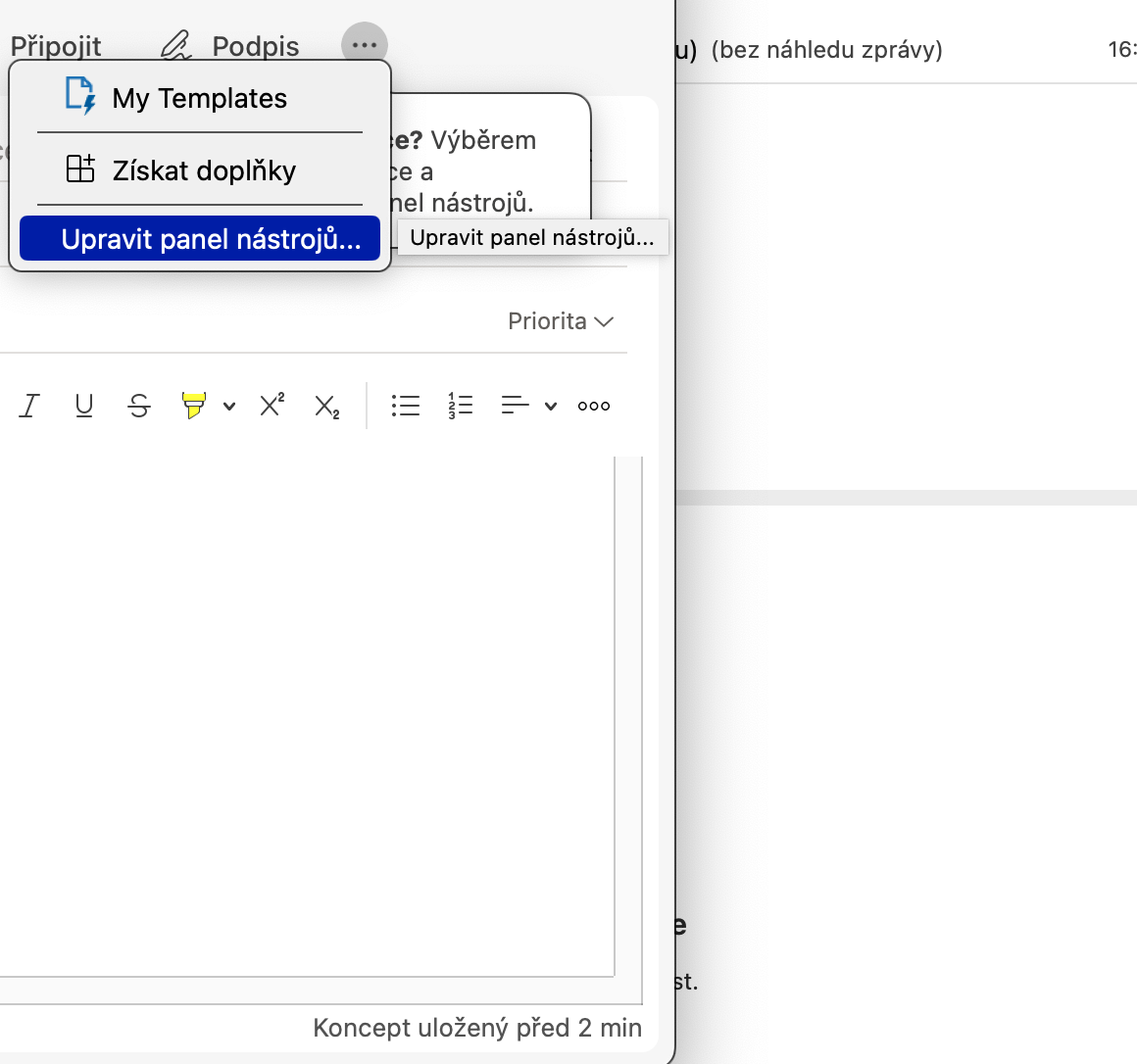 Pokud jste si Outlook nainstalovali na váš Mac teprve nedávno, jednou z prvních věcí, které budete chtít určitě udělat, je jeho přizpůsobení. Pro přizpůsobení panelu nástrojů v horní části okna pro psaní zprávy nejprve otevřete okno pro novou zprávu. Poté v panelu v horní části okna klikněte na ikonku tří teček a zvolte Upravit panel nástrojů. Poté na horní lištu přetáhněte požadované nástroje.
