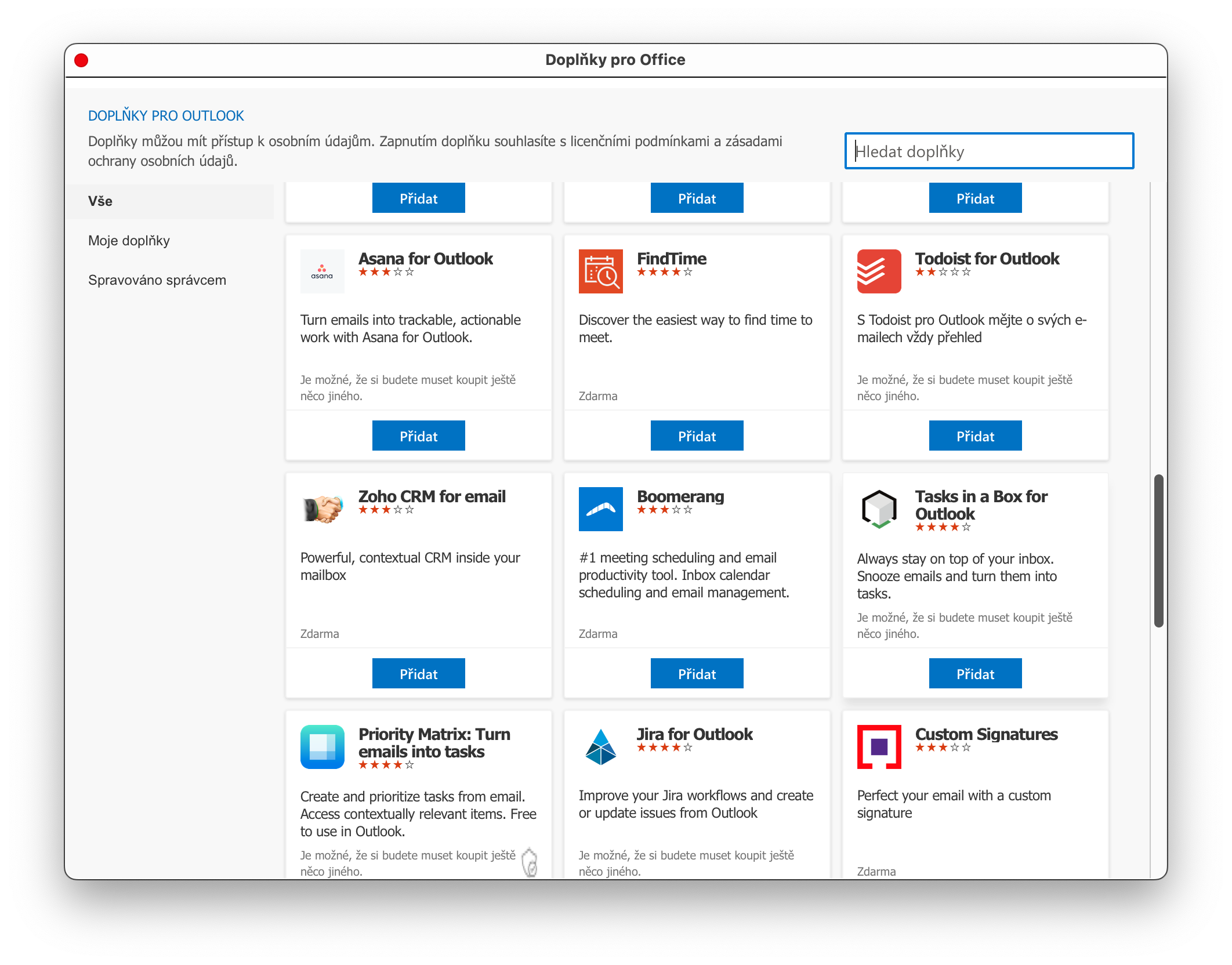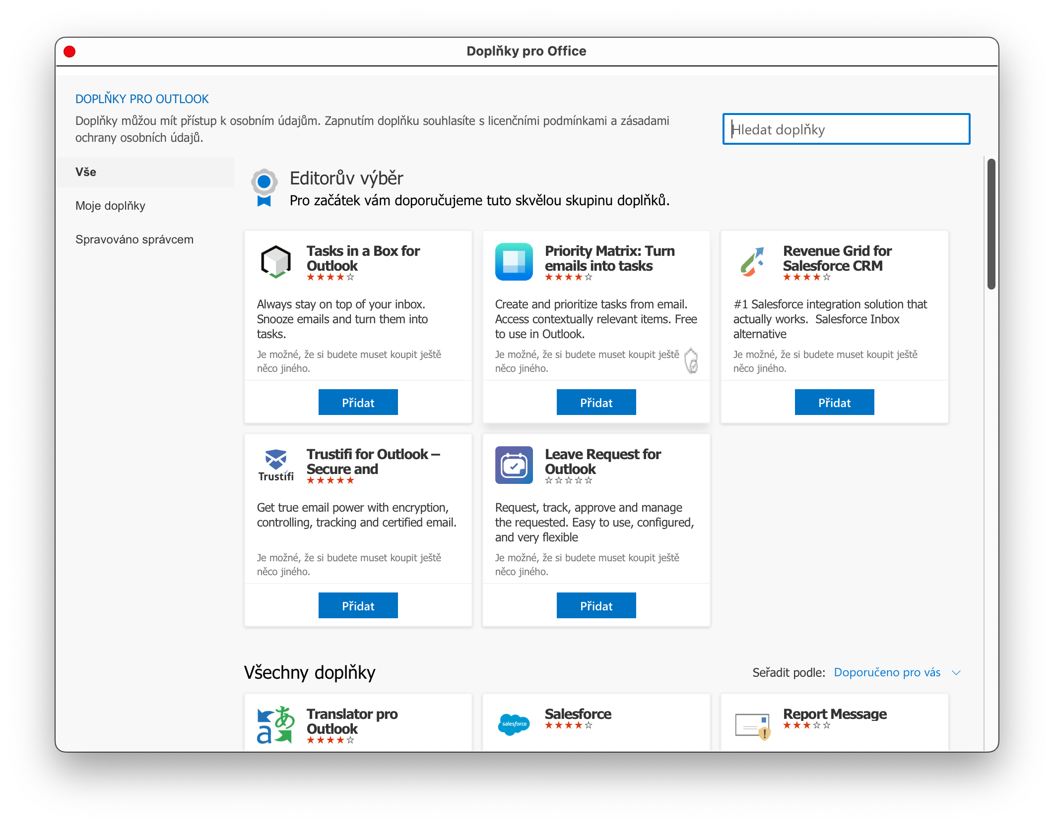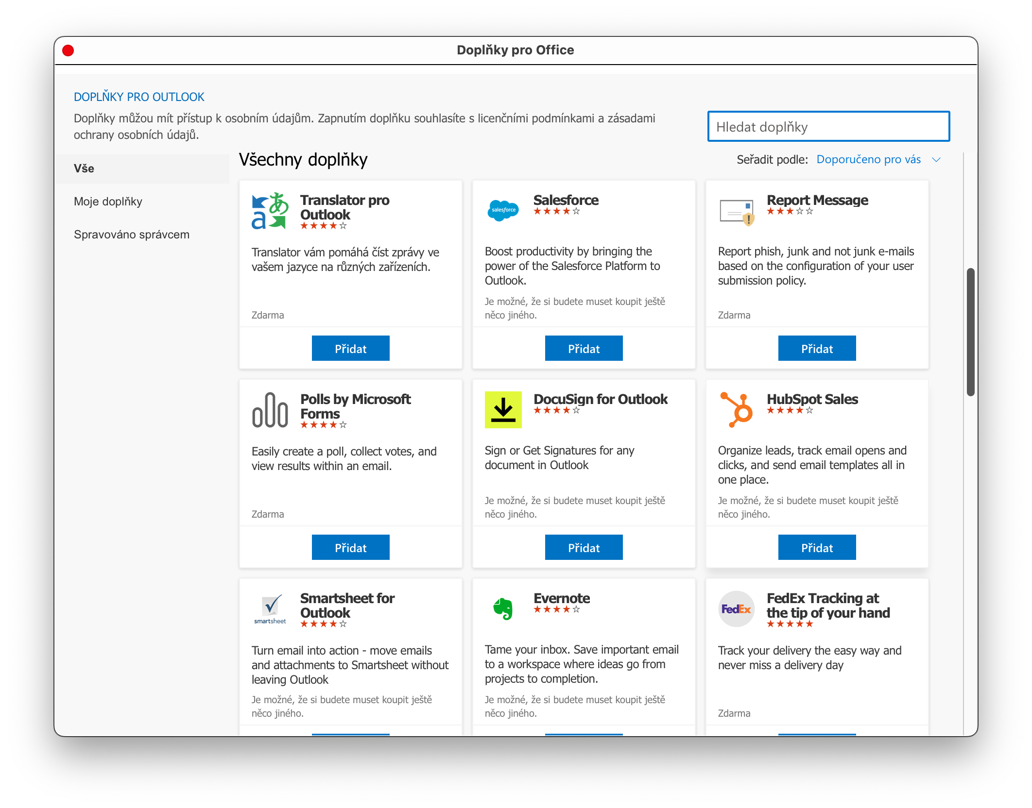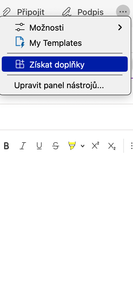 Do Outlooku na vašem Macu si můžete přidat také nejrůznější užitečné doplňky. Zahajte psaní nové zprávy a v horní části okna klikněte na ikonku tří teček. V menu, které se vám zobrazí, zvolte Získat doplňky, a poté kliknutím na Přidat jednoduše nainstalujte vybrané doplňky.