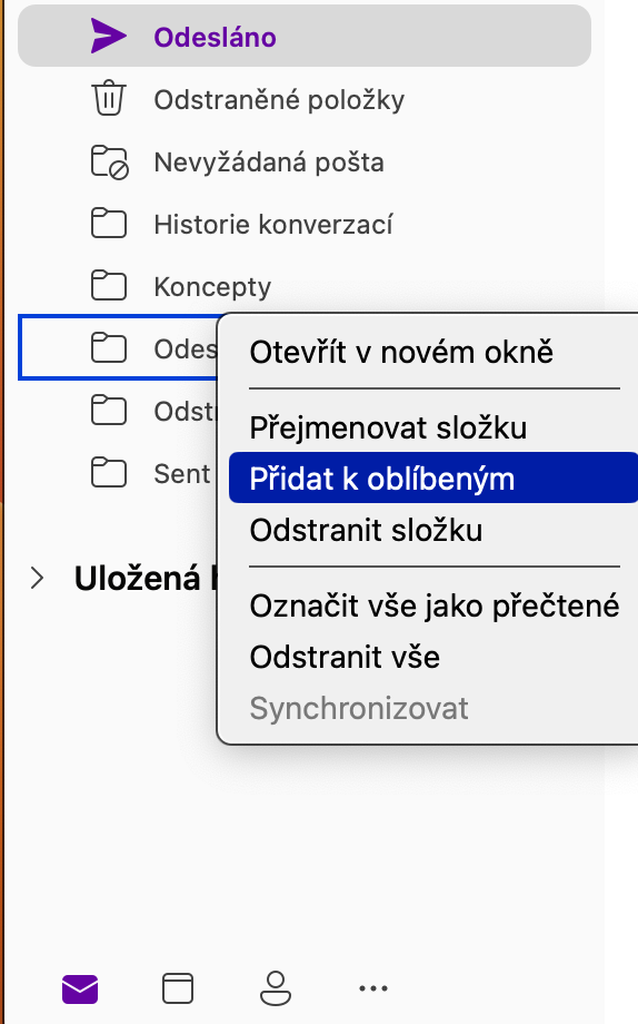 V panelu na levé straně okna Outlooku najdete složky, jako je Nevyžádaná pošta, Odstraněné položky a další. Jednotlivé složky si můžete přidat mezi oblíbené, takže se vždy budou zobrazovat v horní části. Pro přidání vybrané složky mezi oblíbené stačí na danou položku zajet kurzorem myši a kliknout na ikonku hvězdičky. Můžete také kliknout pravým tlačítkem myši a v menu zvolit Přidat k oblíbeným.