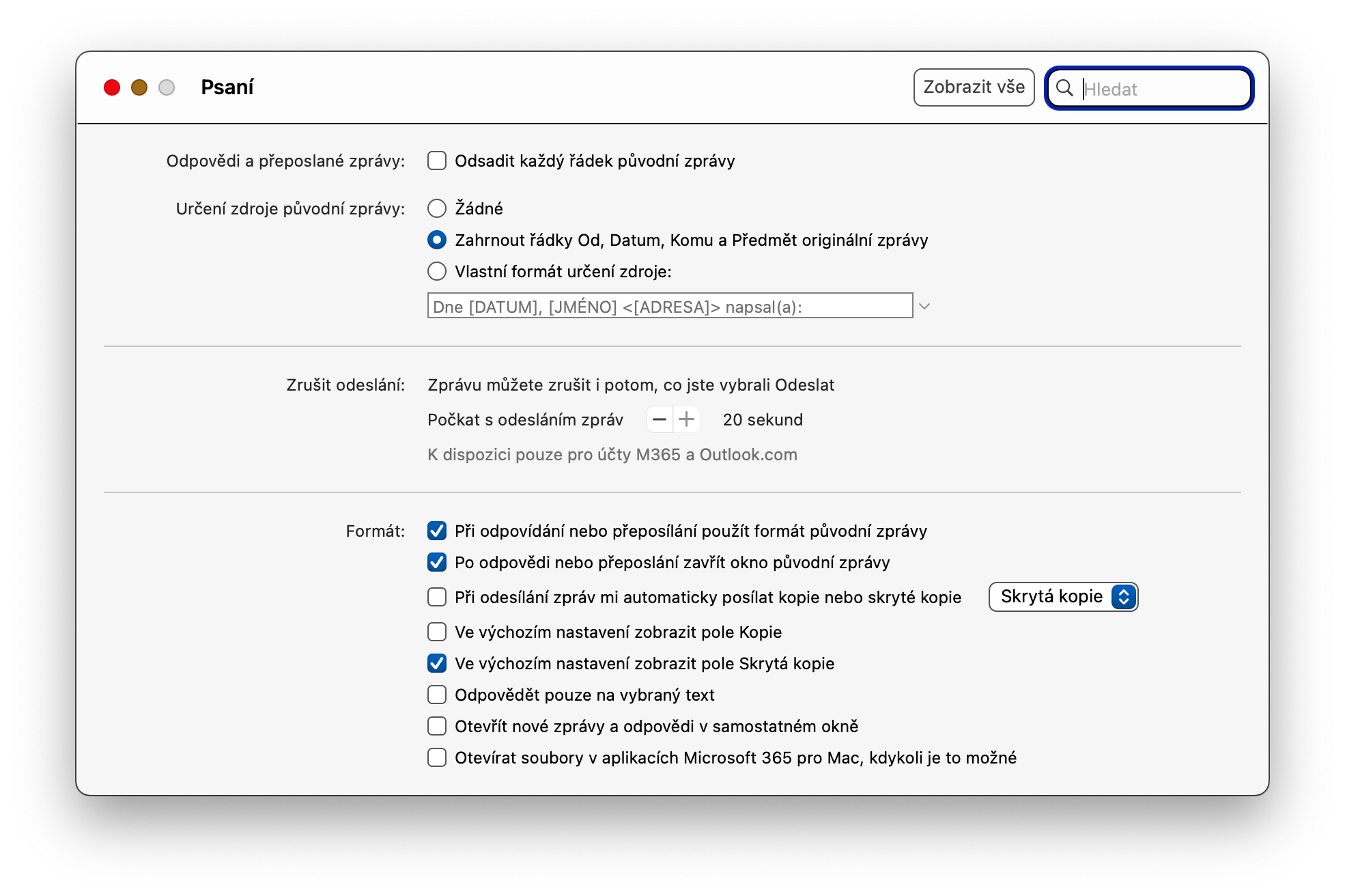 Pokud si chcete podrobněji přizpůsobit podobu odesílaných e-mailů v Outlooku na Macu, spusťte Outlook a klikněte na liště v horní části obrazovky Macu na Outlook -> Nastavení. Zvolte Psaní, a v příslušném okně můžete nastavit podrobnosti, jako je zobrazení zdroje původní zprávy, prvky, které mají zobrazovat v okně odesílané zprávy, a další podrobnosti.