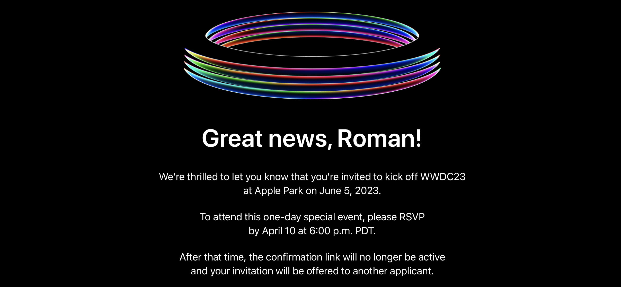 Když Apple v letošním roce spustil registrace na WWDC 2023, říkal jsem si, že za to nic nedám a registroval jsem se. Když mi dnes v noci dorazil email informující o tom, že mé vstupenky jsou připraveny, nevěřil jsem svým očím. O Apple se zajímám 15 let a nikdy by mě nenapadlo, že se jednou podívám na WWDC. Nyní, pokud vše dobře dopadne ohledně cesty, se do Apple Parku skutečně podíváme. Pozvánka, kterou jsem obdržel, je na celodenní akci, která začíná už v 8 ráno a končí až v 20:00. Jak sám Apple píše, většina aktivit bude probíhat venku. Součástí je samozřejmě i občerstvení a vše, co ke správné události patří.