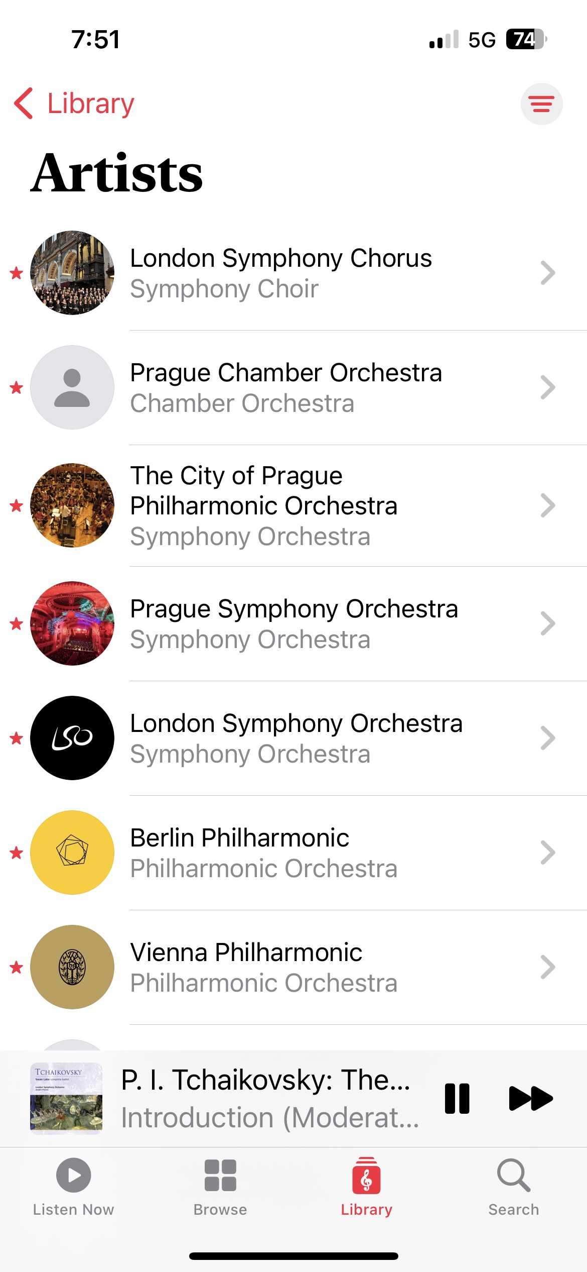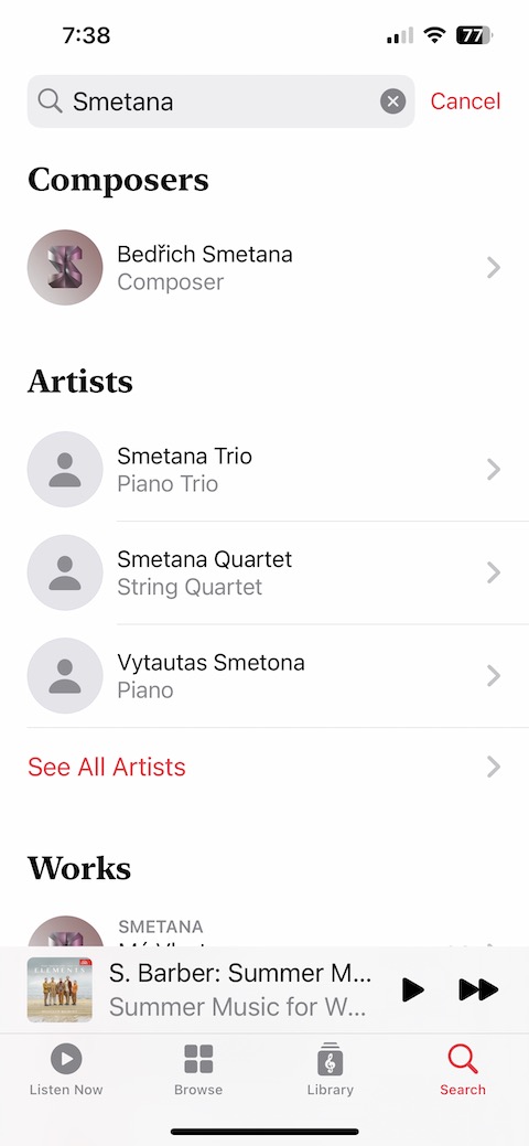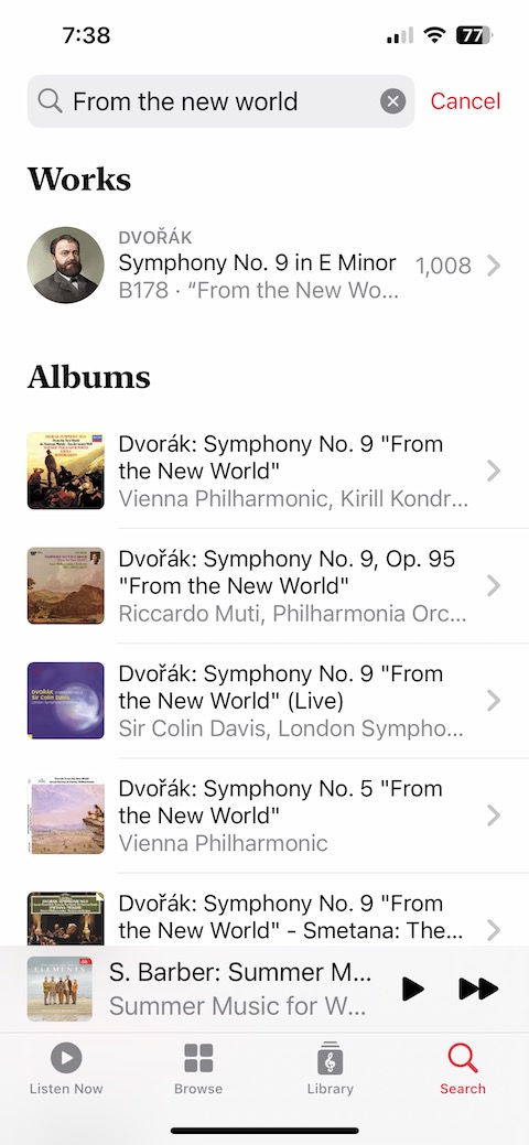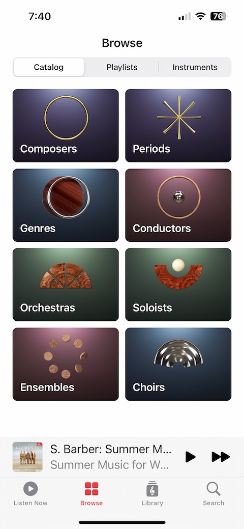Apple Music Classical nabízí mnohem bohatší možnosti vyhledávání oproti Apple Music. Můžete vyhledávat podle skladatele, katalogového čísla, dirigenta, interpreta a řady dalších parametrů. Skvělé možnosti nacházení obsahu k poslechu nabízí sekce Browse po klepnutí na příslušnou kartu ve spodní části displeje. Zde můžete procházet skladby z konkrétní éry, procházet žánry, dirigenty, sbory, tělesa nebo skladatele. V horní části sekce Browse můžete přepínat pro zobrazení výběru playlistů nebo nástrojů.