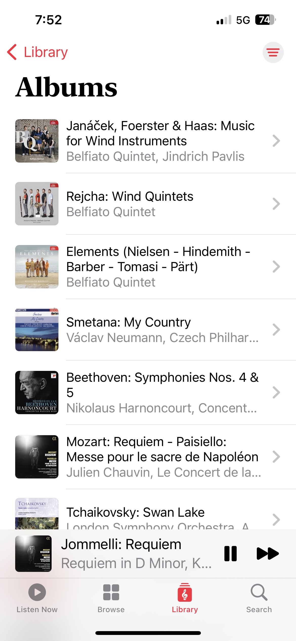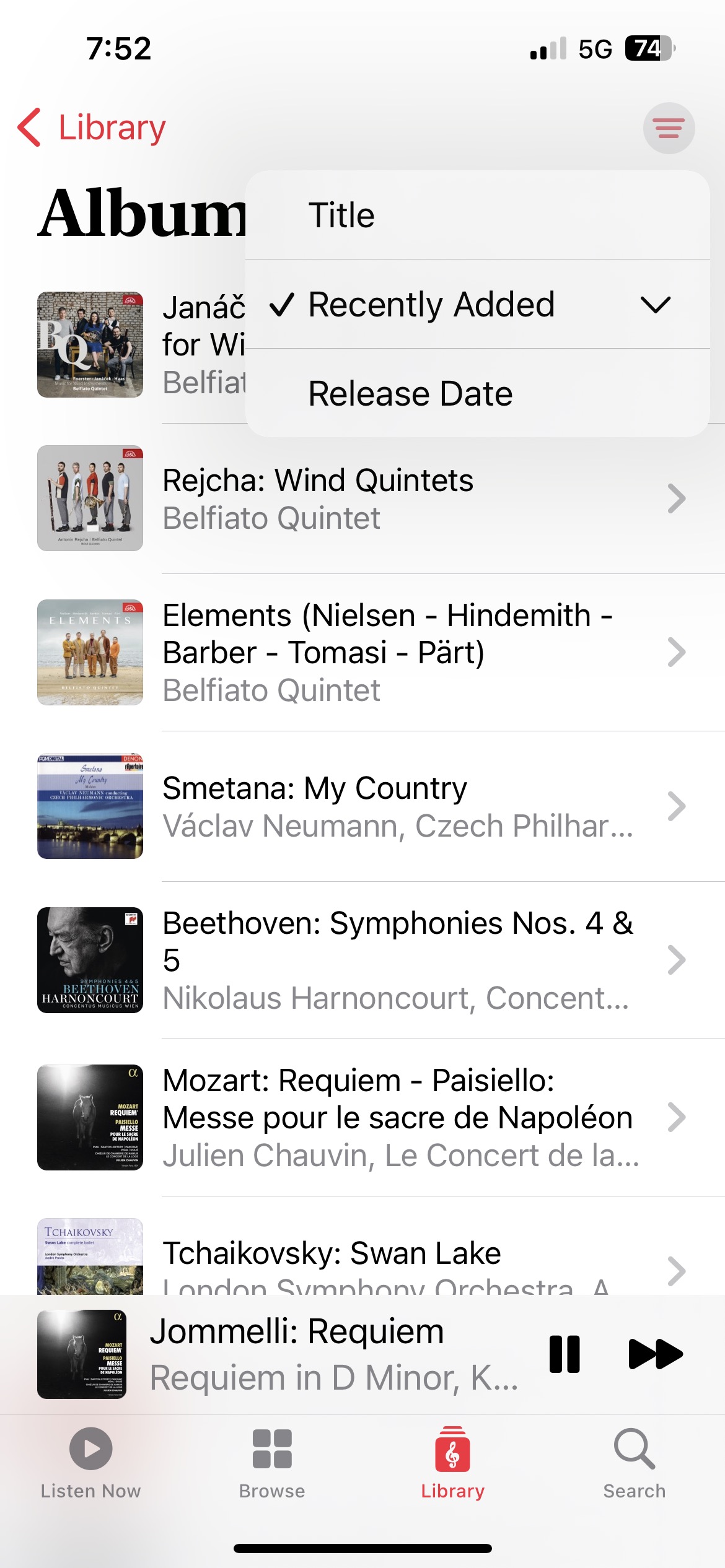 Podobně jako u původní Apple Music si také v Apple Music Classical můžete přidávat do knihovny vybrané skladby, alba i playlisty. Knihovna je roztříděná do alb, playlistů, skladeb, umělců, nahrávek, děl a skladatelů. Pro seřazení položek v jednotlivých kategoriích klepněte na tlačítko pro seřazení v pravém horním rohu displeje a zvolte parametry řazení.