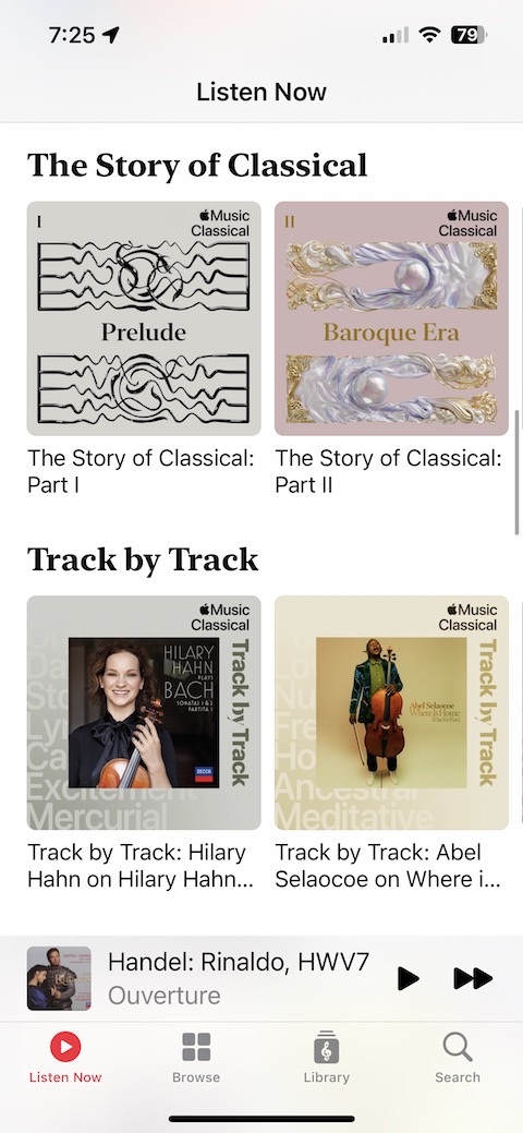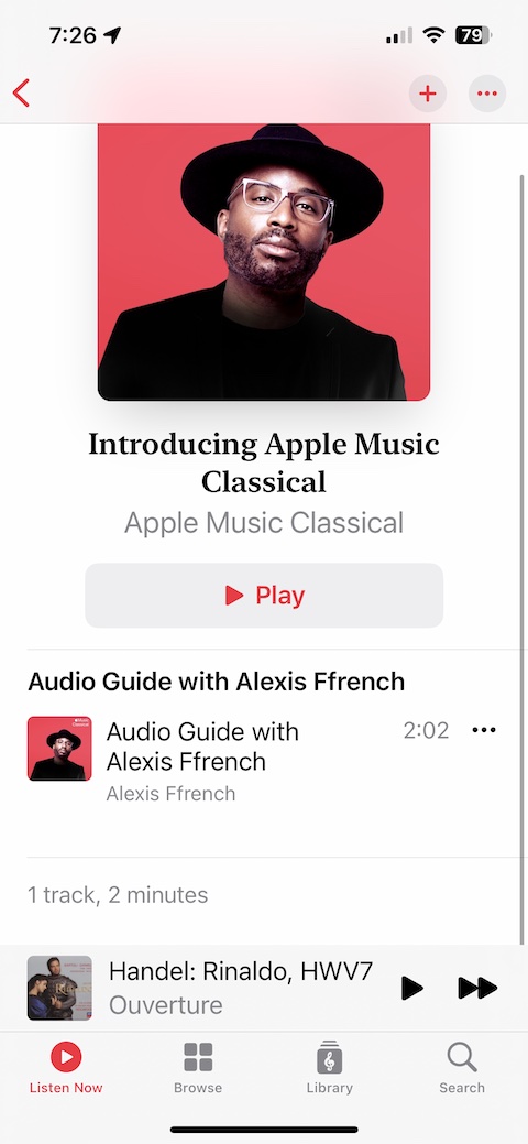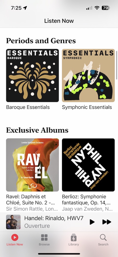V době psaní tohoto článku byla Apple Music Classical v angličtině, budeme zde tedy uvádět anglické názvy jednotlivých položek. Pokud se chcete ponořit do poslechu klasické hudby a nevíte, kde pořádně začít, je pro vás sekce Listen Now naprosto ideální. Najdete zde nově vydaná alba, exkluzivní nahrávky, možnost poslechu výběru toho nejlepšího z vybraných dob a žánrů, playlisty se zásadními díly nejznámějších skladatelů, a pokud v horní části obrazovky klepnete na Introducing Apple Music Classical, můžete si poslechnout dvouminutového hlasového průvodce v podání Alexise Ffrenche.