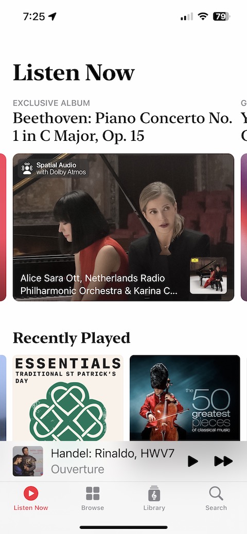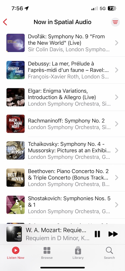 Klasická hudba zni s využitím prostorového zvuku opravdu úchvatně. Apple Music Classical samozřejmě nabízí podporu pro Spatial Audio. Pokud chcete zjistit, které skladby si můžete pustit s prostorovým zvukem, klepněte vlevo dole na položku Listen Now. Zamiřte zhruba do poloviny, kde najdete sekci Now in Spatial Audio. Po klepnutí na její nadpis můžete začít objevovat skladby s prostorovým zvukem.