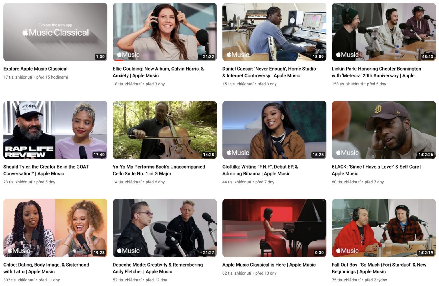 O oficiálním YouTube kanálu společnosti Apple asi už každý slyšel. Víte však, že i Apple Music má svůj oficiální kanál na YouTube a ten je pro fanoušky hudby ještě mnohem zajímavější, než ten přímo určený pro Apple? Pokud vás zajímá hudba, milujete objevovat nová alba a zajímáte se i o zákulisí z nahrávání, pak jsou rozhovory s těmi největšími hvězdami hudební scény určené přesně pro vás. Apple Music na svém oficiálním YouTube kanálu totiž přináší to, co hned tak jinde nenajdete.