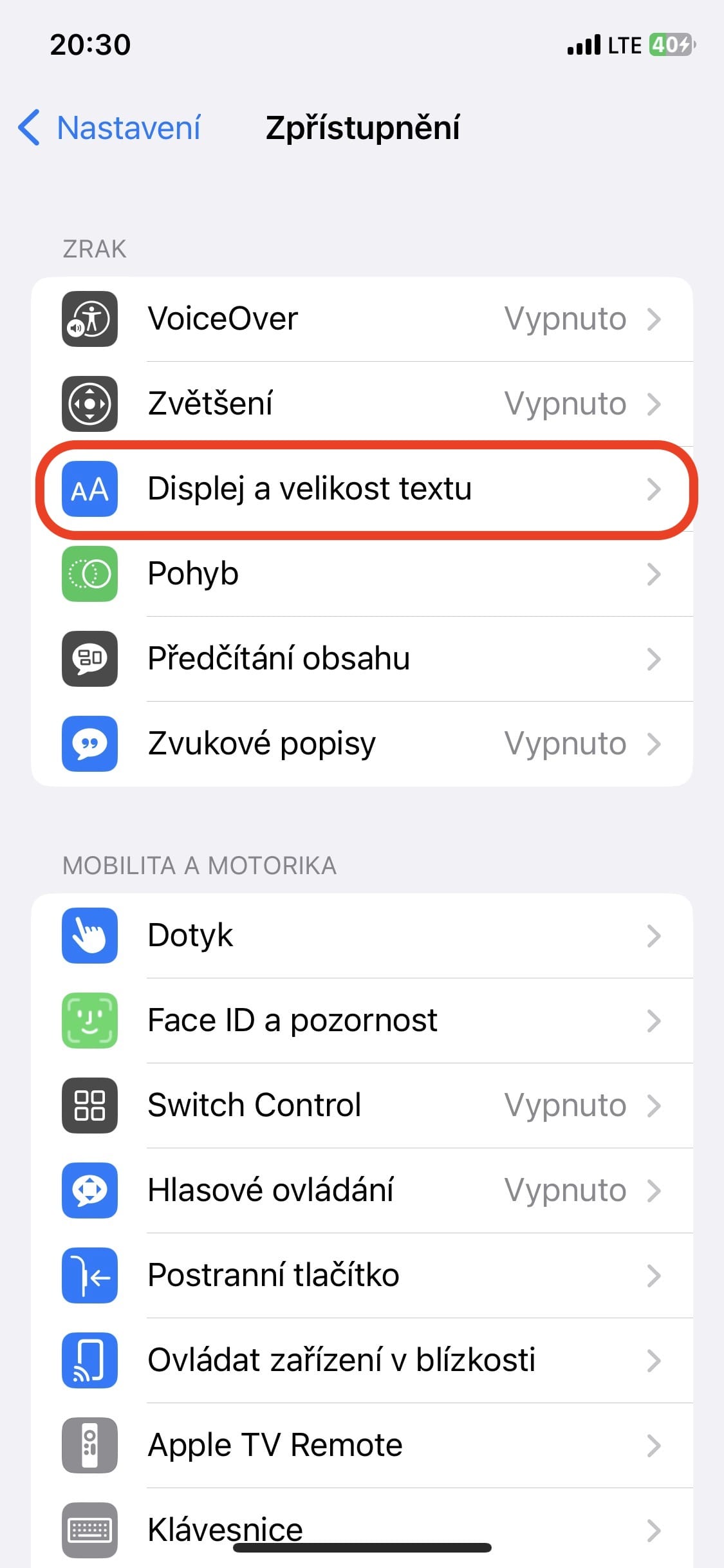 • Ze sekce ZRAK vyberte možnost Displej a velikost textu