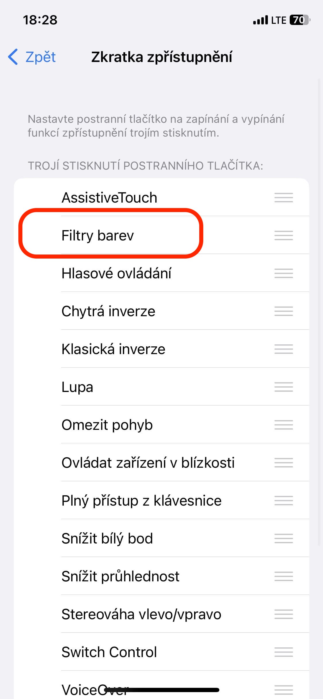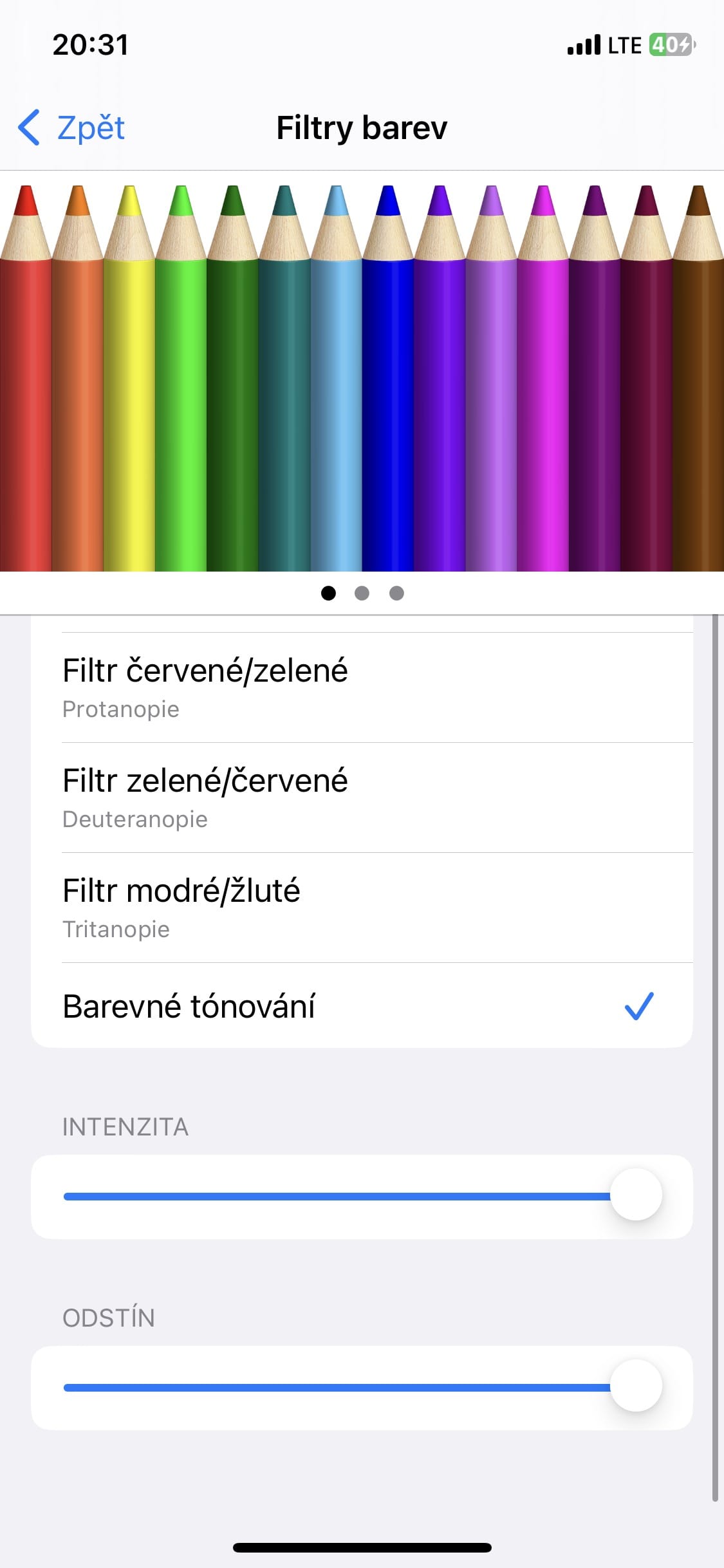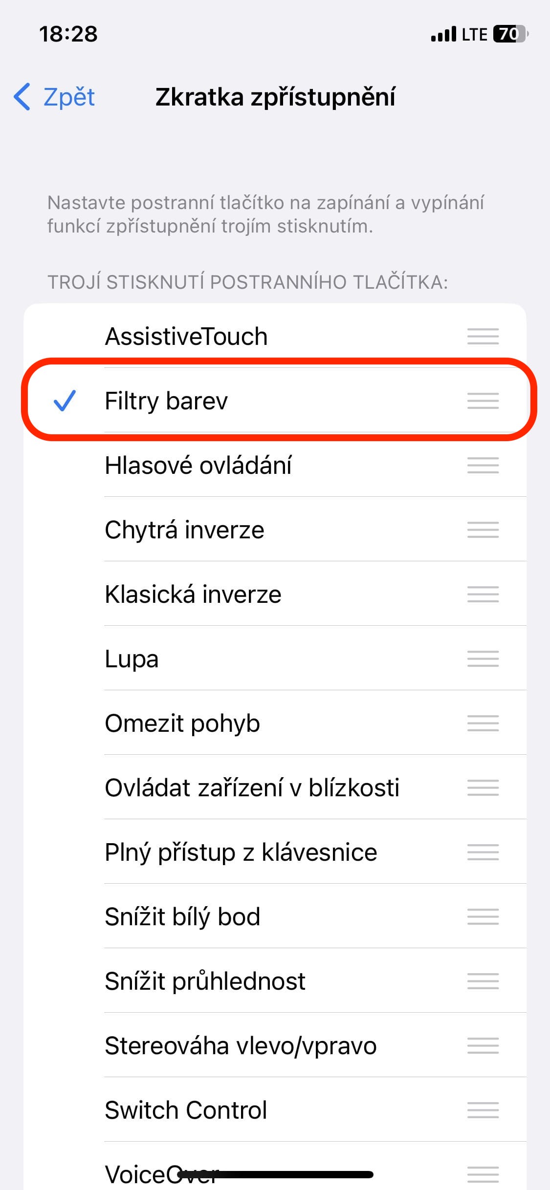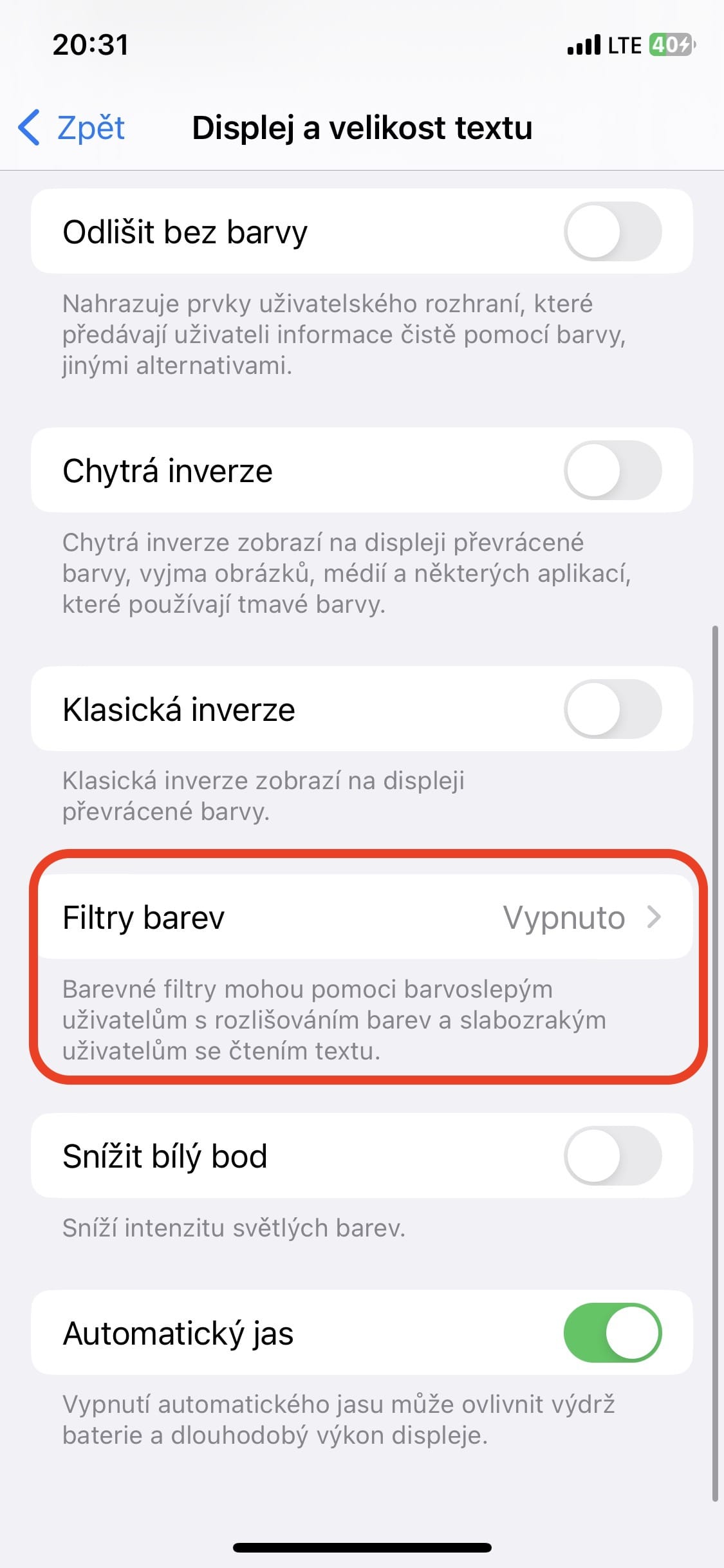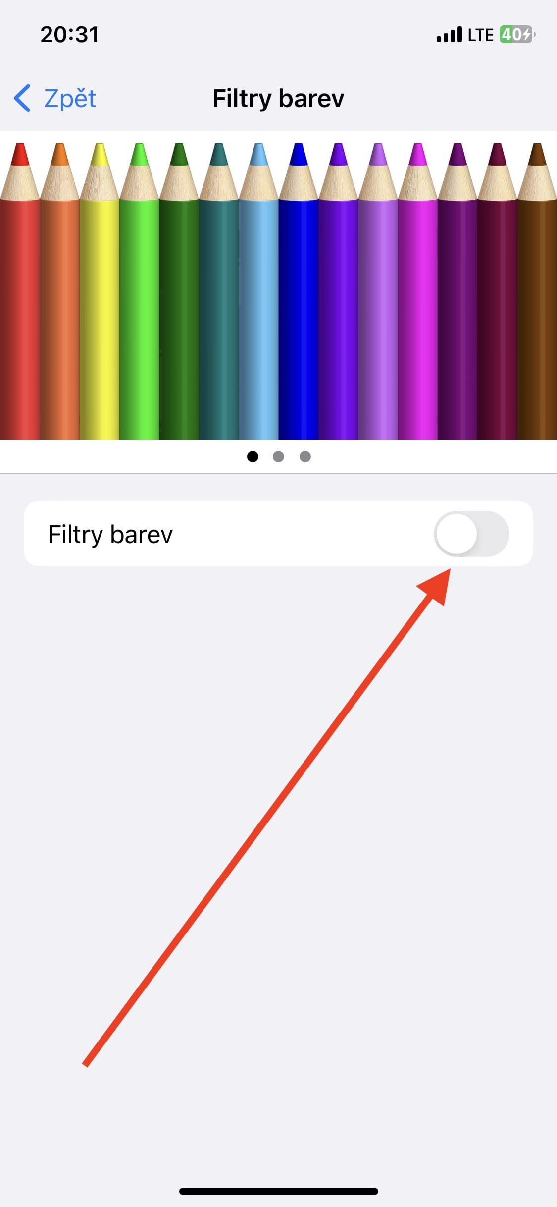 • Najděte možnost Filtry barev a klepnutím ji aktivujte – musí vedle ní být modrá fajfka