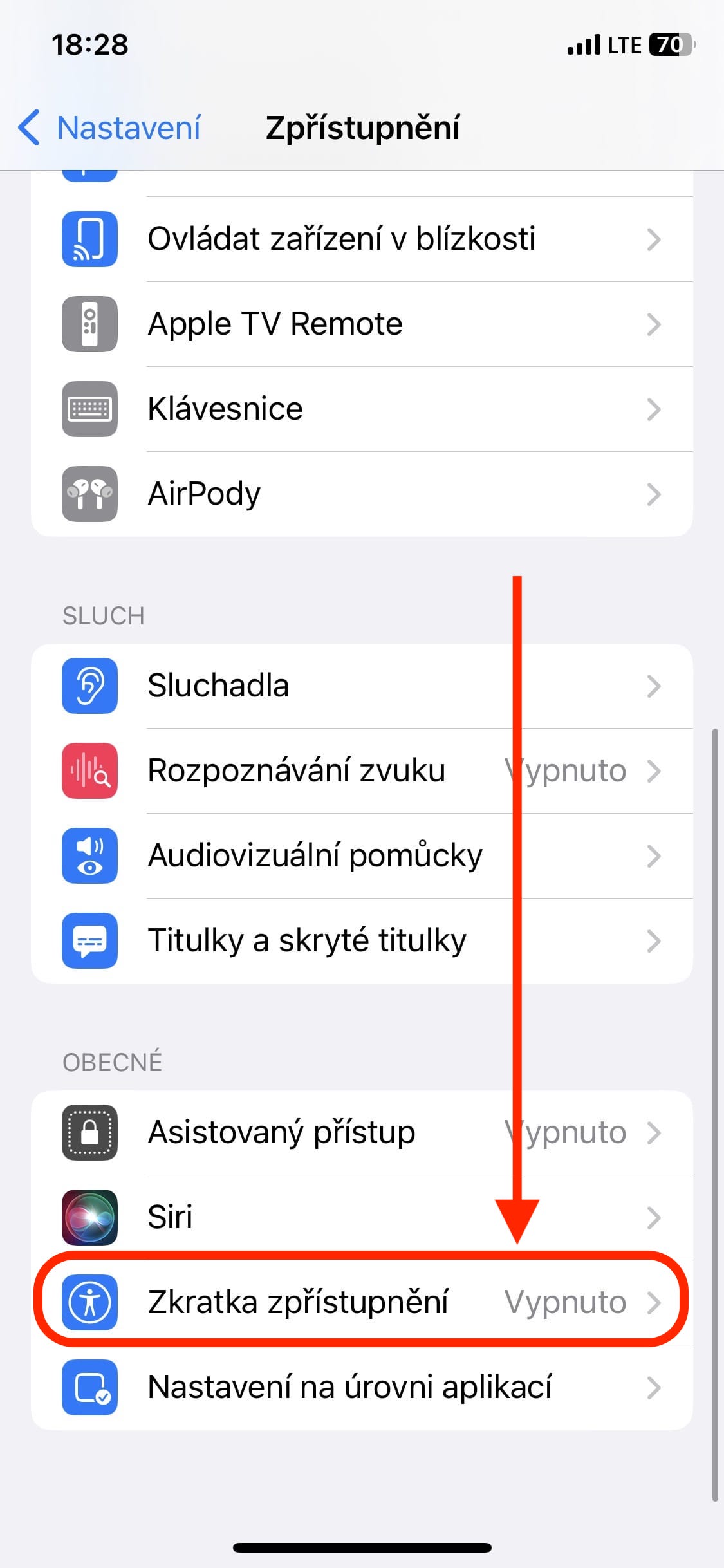 • Nyní sjeďte až na samotný konec a ze sekce OBECNÉ vyberte Zkratka zpřístupnění