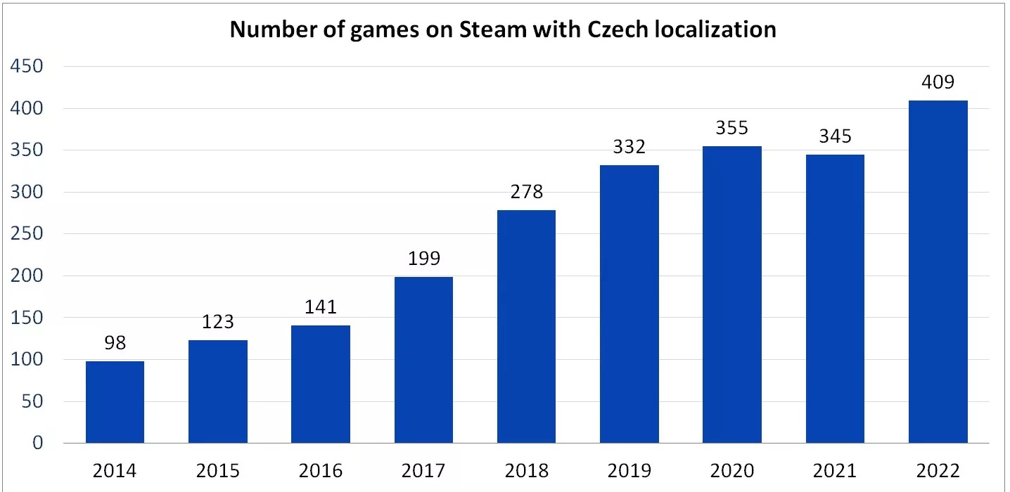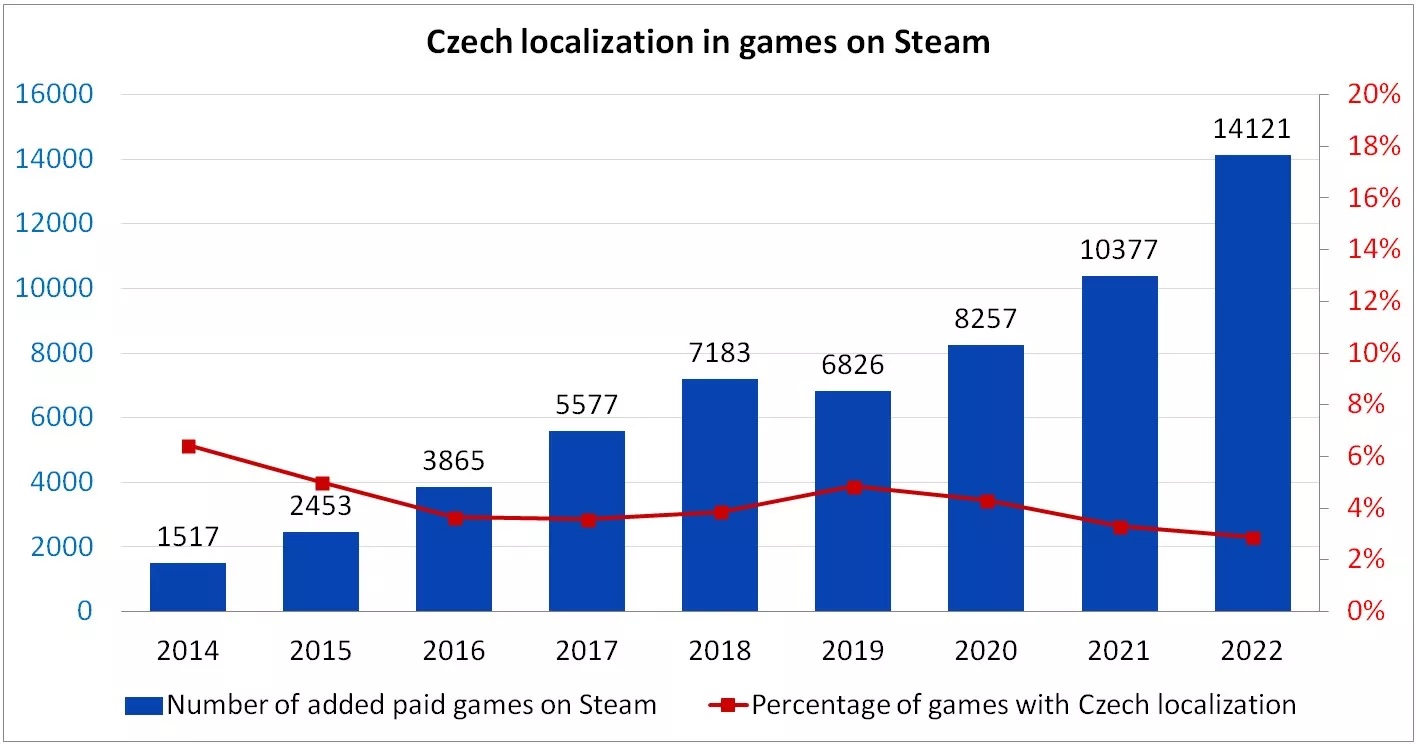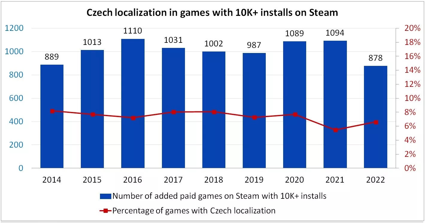 Níže můžete v galerii vidět grafy, které ukazují, jaký poměr her v knihovně Steamu má českou lokalizaci. Podíváme-li se na poměr vůči všem hrám, můžeme si všimnout, že česká lokalizace je přibližně u 3 % her. Na druhou stranu je tato statistika poněkud zkreslující. Databáze Steamu obsahuje velké množství i malých projektů, které jsou mnohdy pouze jen v angličtině a další jazyky si nemohou z finančních důvodů dovolit. Pokud se mrkneme na populárnější tituly, které mají více než 10 tisíc stažení, lze vidět, že poměr her s českou lokalizací se zvýšil na přibližně 6,5 %, což ale také není mnoho. V dalším grafu je pak k vidění konkrétní počet her. V roce 2022 bylo na Steamu 409 her s českou lokalizací. O rok dříve to bylo „pouze“ 345 her. Na jednu stranu lze říct, že skok o více než 60 her za rok je značný. Těžko ale odhadovat, o jaké tituly se jedná. Jak jste na tom vy? Preferujete ve hře českou lokalizaci, nebo vám stačí angličtina?