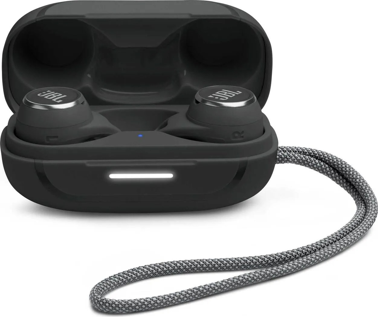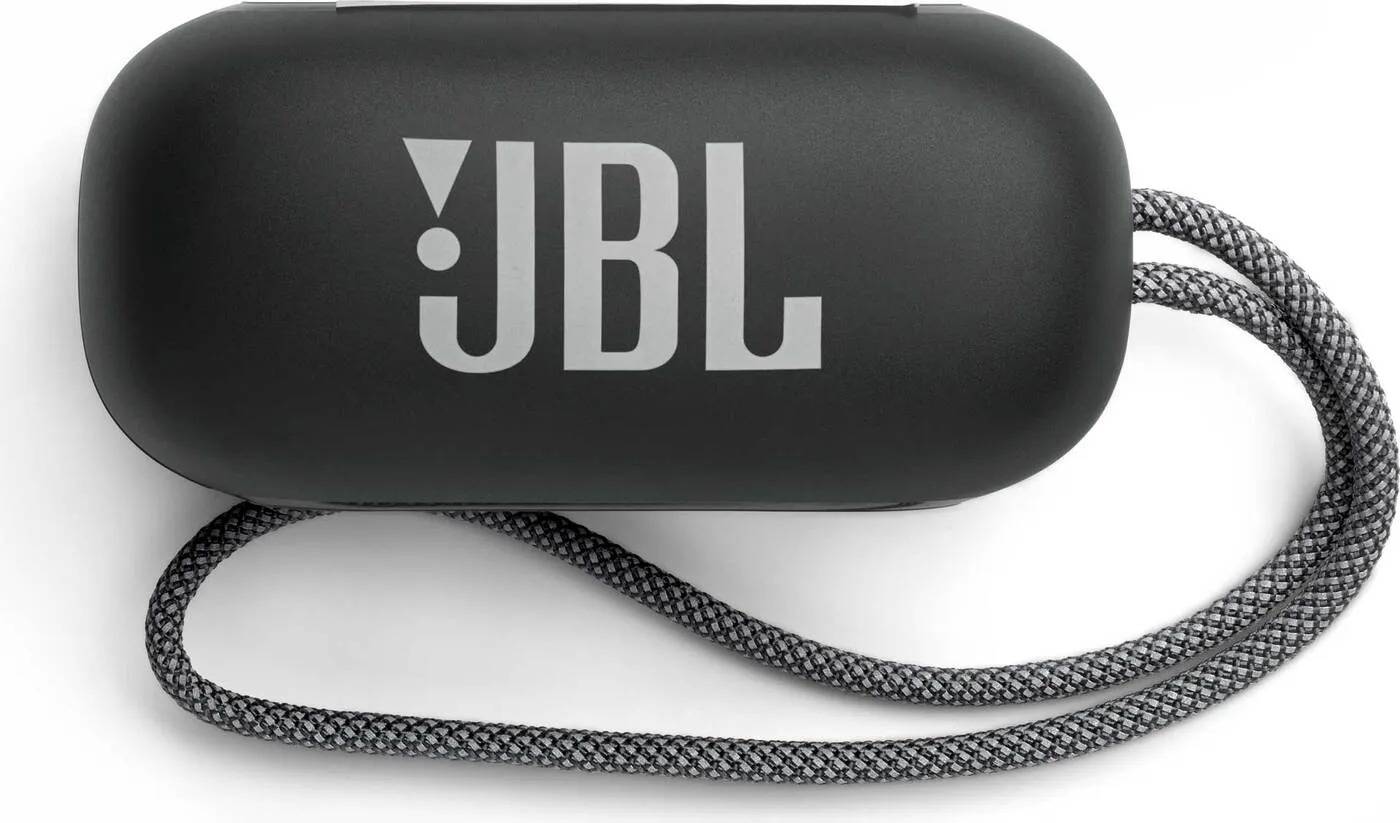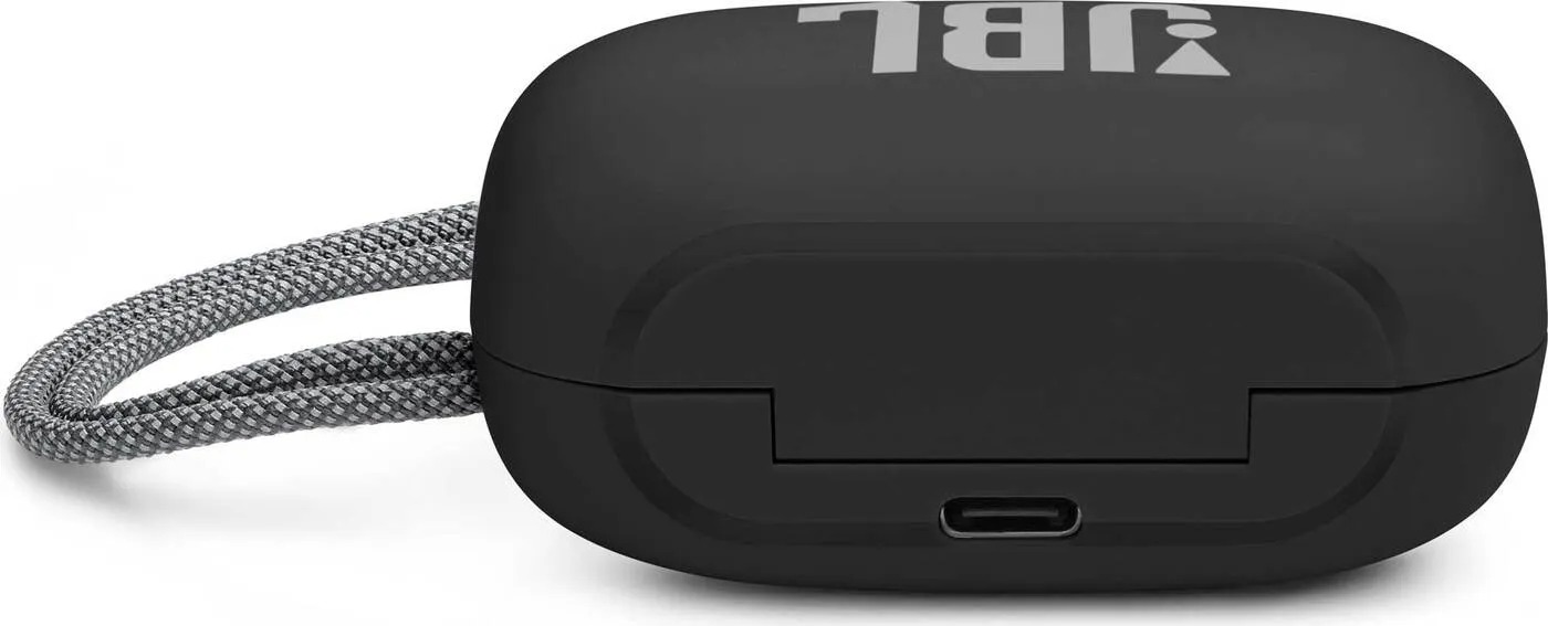 Sluchátka se nachází v obalu pilulkovitého tvaru, která je zhruba o 50% objemnější, než pouzdro od AirPods Pro. I tak jde stále o poměrně kompaktní pouzdro, které se bez problému vejde například do kapsy od kalhot. Pouzdro jako takové je na čelní straně zdobené logem JBL, dále se na něm nachází stavová dioda signalizující stupně nabití sluchátek, nabíjecí USB-C konektor a látkové očko na provlečení. Magnet zavíracího mechanismu je adekvátně silný a dobře brání náhodnému otevření.