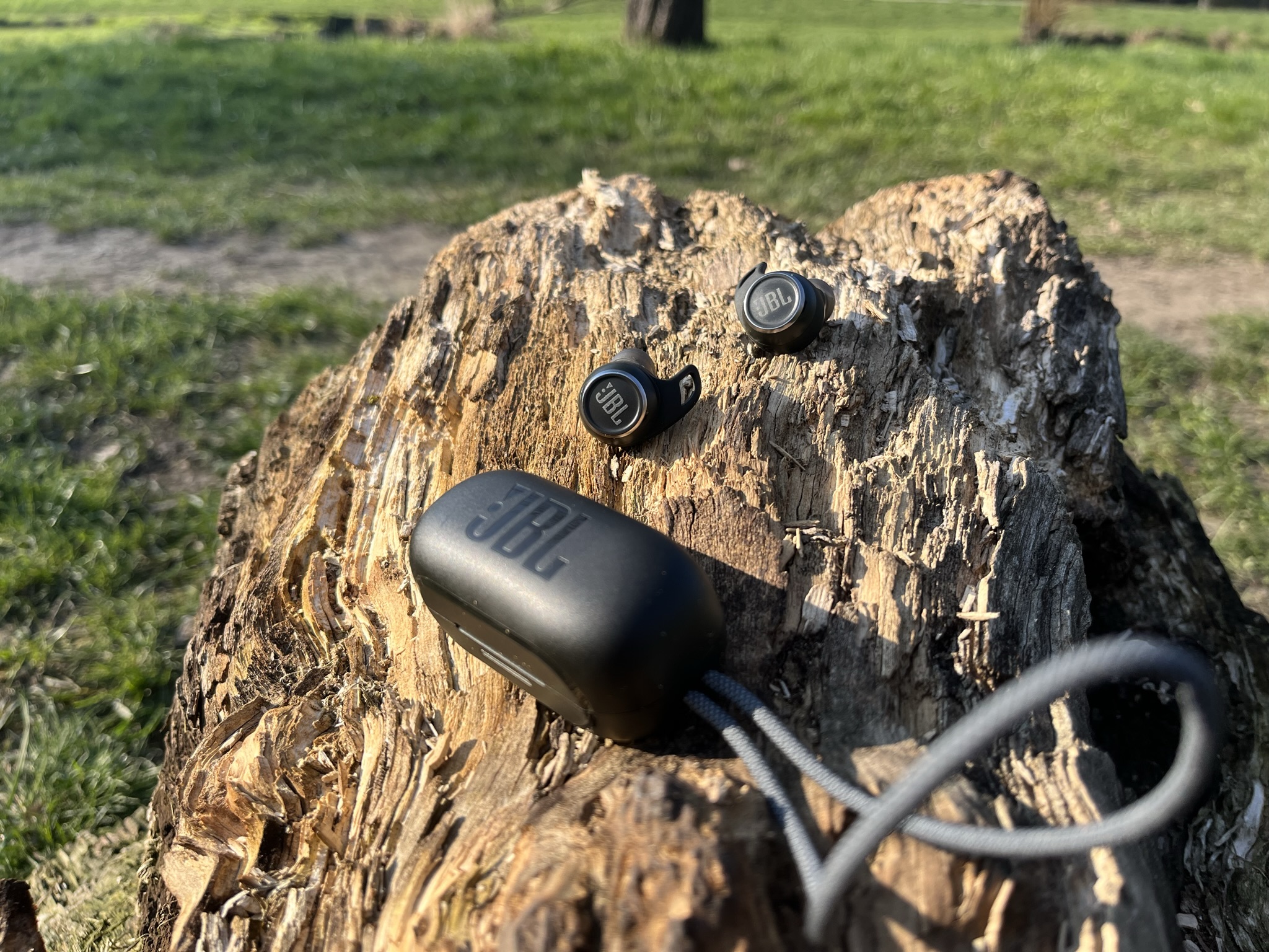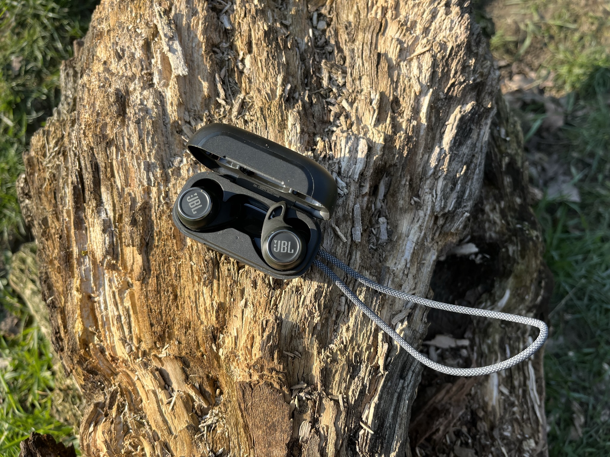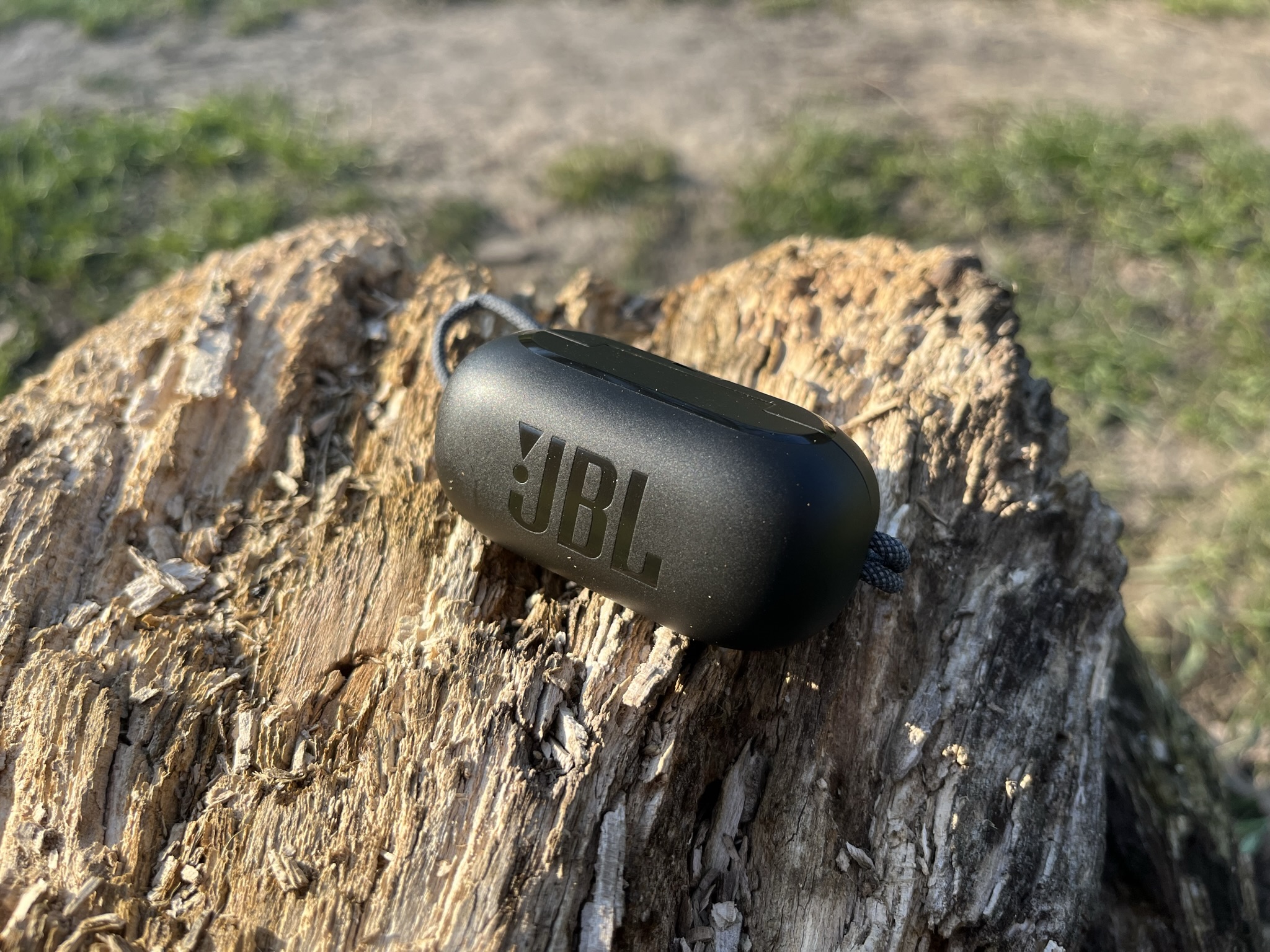 Sluchátka se nachází v obalu pilulkovitého tvaru, která je zhruba o 50% objemnější, než pouzdro od AirPods Pro. I tak jde stále o poměrně kompaktní pouzdro, které se bez problému vejde například do kapsy od kalhot. Pouzdro jako takové je na čelní straně zdobené logem JBL, dále se na něm nachází stavová dioda signalizující stupně nabití sluchátek, nabíjecí USB-C konektor a látkové očko na provlečení. Magnet zavíracího mechanismu je adekvátně silný a dobře brání náhodnému otevření.