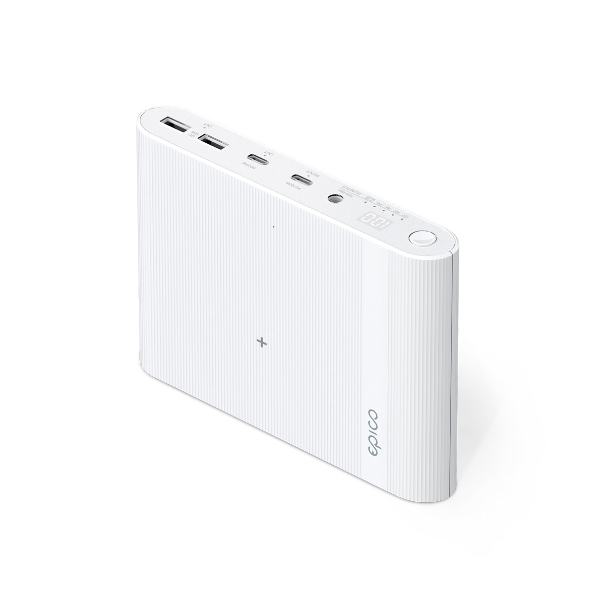 Pojďme si také ještě popsat pozice jednotlivých prvků. Z horní strany na nás čeká logo společnosti Epico, dioda indikující nabíjení a malé plusko, které určuje prostor určený k bezdrátovému nabíjení. Zbytek se pak nachází na boční straně. Zde totiž najdeme tlačítko pro zapnutí či nastavení, LED displej, který informuje o stavu nabití samotné powerbanky, a jednotlivé konektory, které jsme si už zmínili výše.