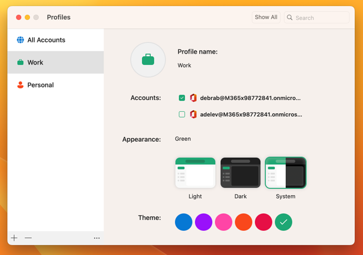 Nová funkce toho však dokáže nabídnout ještě víc. Každý profil může mít vlastní téma s odlišnou barvou a vzhledem okna. Profily lze také propojit se systémovými filtry režimu soustředění. Pro využití užitečné novinky je samozřejmě zapotřebí mít k aplikaci připojeny alespoň 2 účty.
