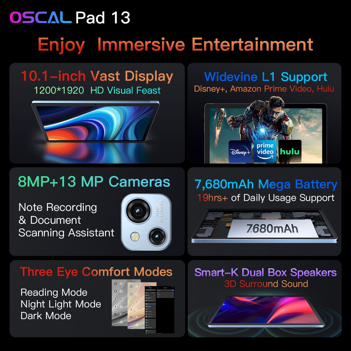 Oscal Pad 13 je nejnovějším přírůstkem do portfolia společnosti, který si zakládá na zcela zásadních vylepšeních v oblasti výkonu, efektivity a spolehlivosti. Hned na první pohled se totiž vyznačuje svým ultratenkým tělem s tloušťkou pouhých 7,6 milimetrů a hmotností 435 gramů. K dostání je navíc ve dvou stylových provedeních, a to v ledovcově modré a vesmírně šedé. Jak už jsme také naznačili, důležitou roli u něj hraje jeho displej. V tomto případě výrobce vsadil na 10,1“ displej s FullHD rozlišením a podporou Widevine L1 pro sledování streamovacích platforem.