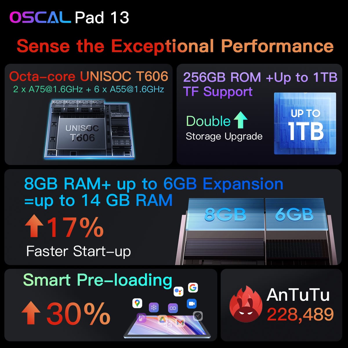 To nejlepší se ale ukrývá uvnitř. V útrobách tabletu totiž tepe výkonný čipset s osmijádrovým procesorem UNISOC T606, což jde ruku v ruce s 8GB operační pamětí RAM. Ta lze navíc navýšit o dalších 6 GB až na 14 GB. Co se pak týče úložiště, zde se bavíme o 256 GB. Stejně tak se nabízí možnost rozšíření prostřednictvím paměťové karty až o 1 TB. Není tedy pochyb o tom, že je Oscal Pad 13 perfektním a především výkonným kouskem, který si hravě poradí s jakýmkoliv úkolem. Určitě také nesmíme zapomenout zmínit jeho baterii s kapacitou 7680 mAh, zajišťující více než 19hodinovou výdrž, kvalitní zadní fotoaparát s dvěma čočkami a Dual Box Smart-K reproduktory, které se dokážou postarat o prvotřídní 3D zvuk.